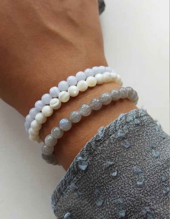 Blue lace agate, Labradorite and mother of pearl stretch bracelet stacking set
