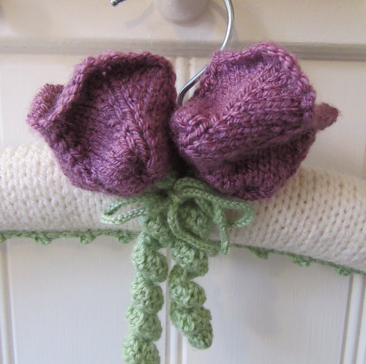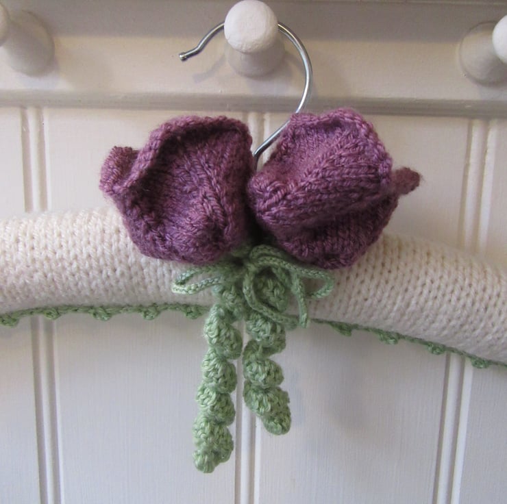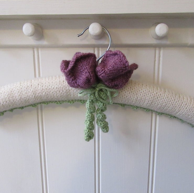 A handknitted 'Queen of the Night Tulip' ladies coat hanger. The wooden hanger has been wrapped in wadding for padding and then overlaid in a cream coloured hand knitted cover. All beautifully finished with a spring green crocheted picot edging. The Queen of the Night Tulips are knitted in a deep plum coloured yarn with green stamens and curly crocheted stems. The two flower heads are tied under the metal hook with a green handmade green cord.