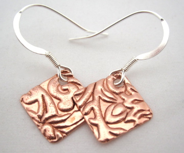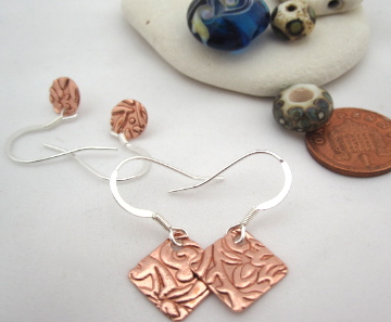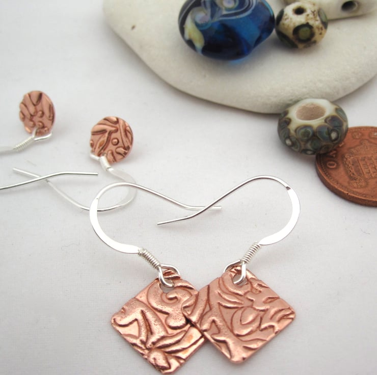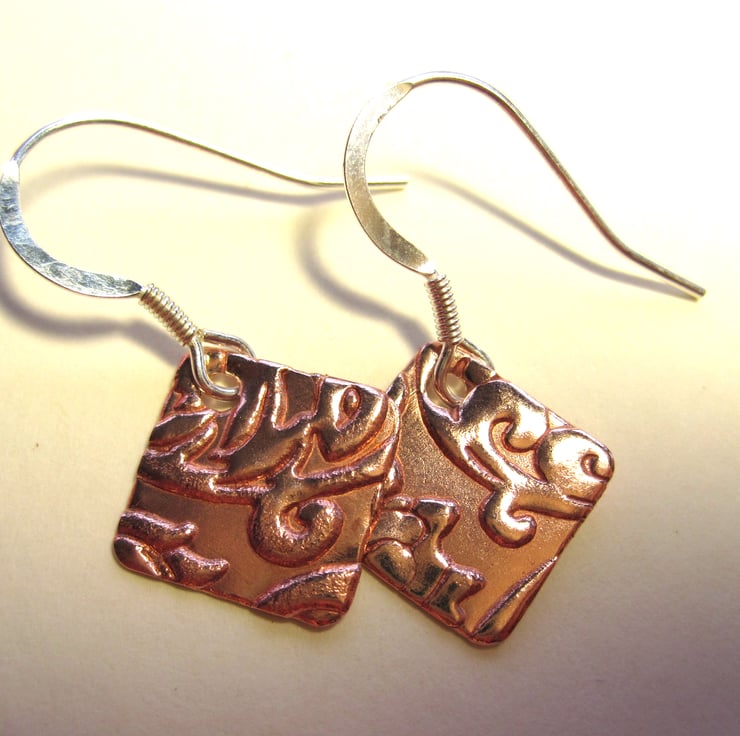 Patterned Copper drop earrings made from silver & copper. Simple, earrings suitable for everyday, light & comfortable to wear with the warm colour of Copper. The Silver post or hook is gentle on even the most sensitive skin.