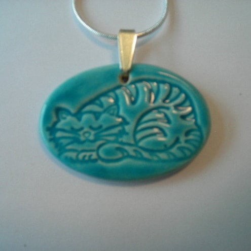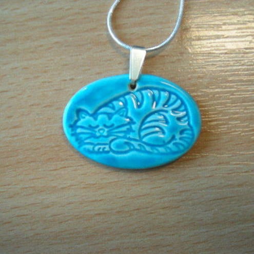 Oval ceramic pendant with impressed sleeping cat on sterling silver bail and 18inch snake chain.