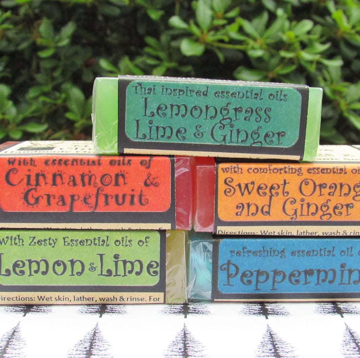 80% Organic Soap, glycerine based, PH 7. Vegan & Cruelty Free. No SLS, No Parabens, No perfume - I only use essential oils (for me nature provides the best). Please look at the second photograph & add a note with your order to know which of the 5 essential oil blends availiable you would like.