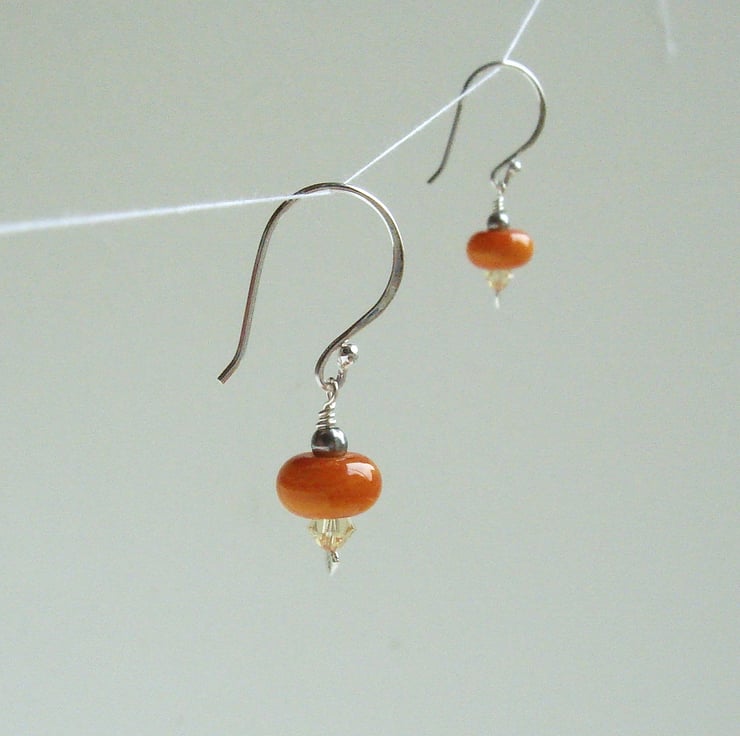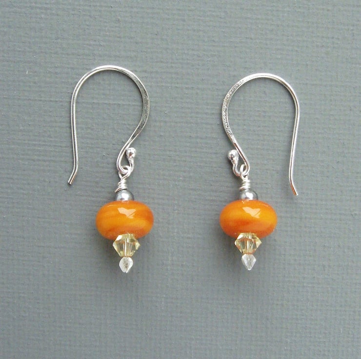 These daffodil yellow and orange coloured earrings have been made by hand at my home in West Sussex. The sterling silver head-pins on which the Swarovski Crystal and British Lampwork beads are mounted have been specially shaped by me so that the ends resemble a leaf or a tiny flame. The highly burnished surface of the silver catches the light and reflects onto the crystals amplifying the sparkle. These cheerful earrings measure 35 mm 1 1/4" in length.