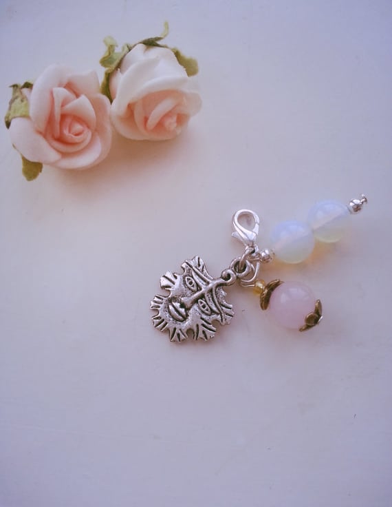 A handmade rose quartz, opalite beads and green man charm, Comes on a lobster clasp ready to clip on to your necklaces, bracelets and keyrings.