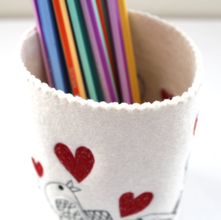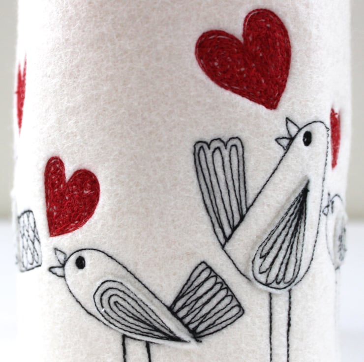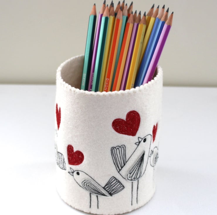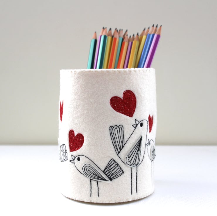 A unique 100% felt pen pot, adorned with sewn little birdies, each singing out sewn red love hearts.