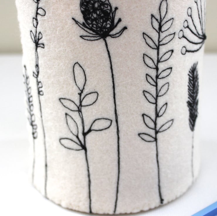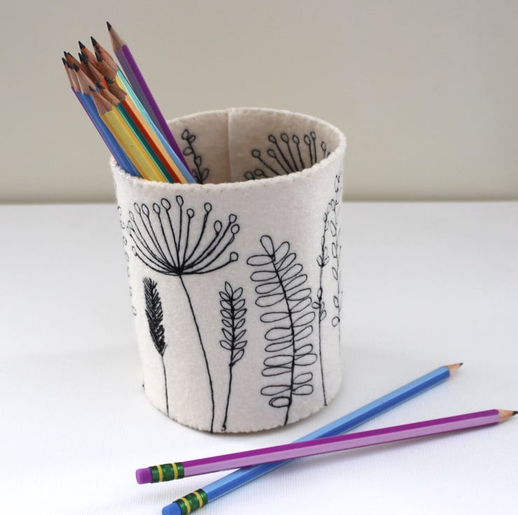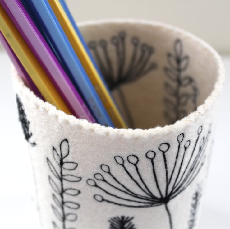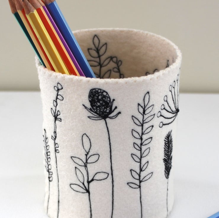 A unique 100% felt pen pot, adorned with sewn flora including seed pods, leaves and twigs.