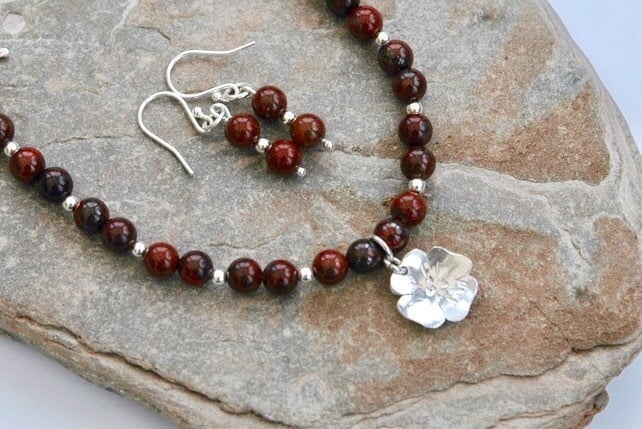 This glowing sterling silver bracelet features gemstone beads of poppy jasper, a warm red form of brecciated jasper found in California and some other parts of the world. The name is associated with the pattern and colours, ranging from deep burgundy to brick red. To echo the pretty name I have added a sterling silver poppy flower charm, cut by hand from silver sheet then textured and domed. The spiral T-bar clasp is also of sterling silver, handmade by me and hallmarked by the London Assay Office. The total length of the bracelet is 21cm, 81/4in and it is a comfortable fit on a medium-sized wrist. There are 24x6mm round beads of poppy jasper and 12x3mm sterling silver beads to add light and sparkle. A pair of matching earrings is also available in my Folksy shop - see last photo. Buy them together with the bracelet for an extra special gift!
