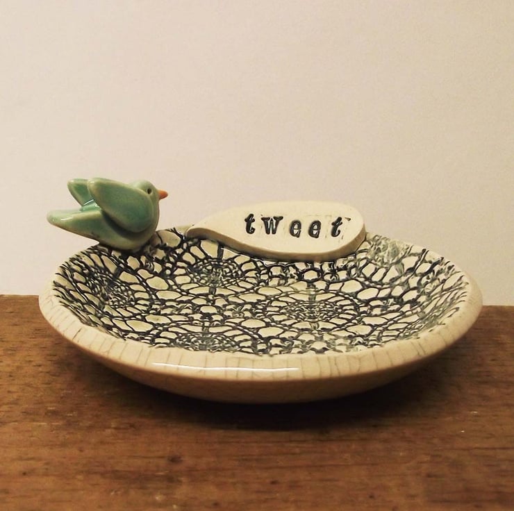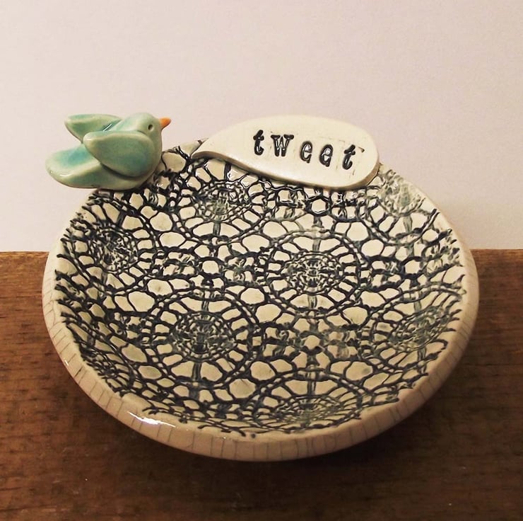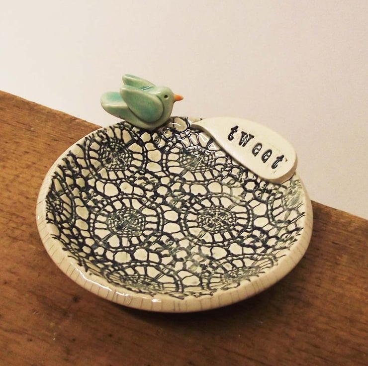 This cute little dish is made from white earthenware clay and decorated with a little blue bird.