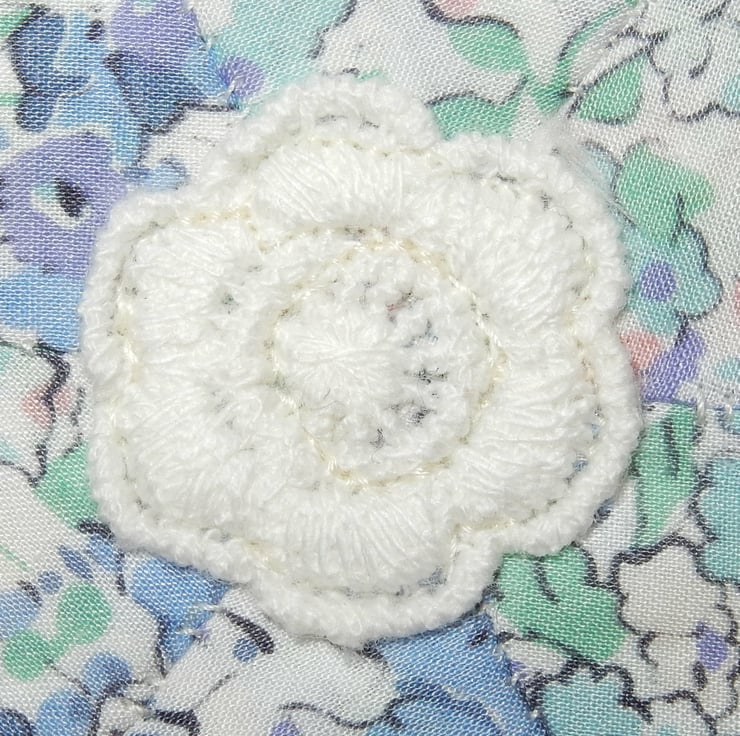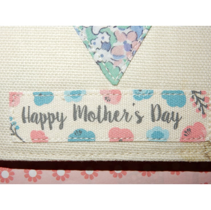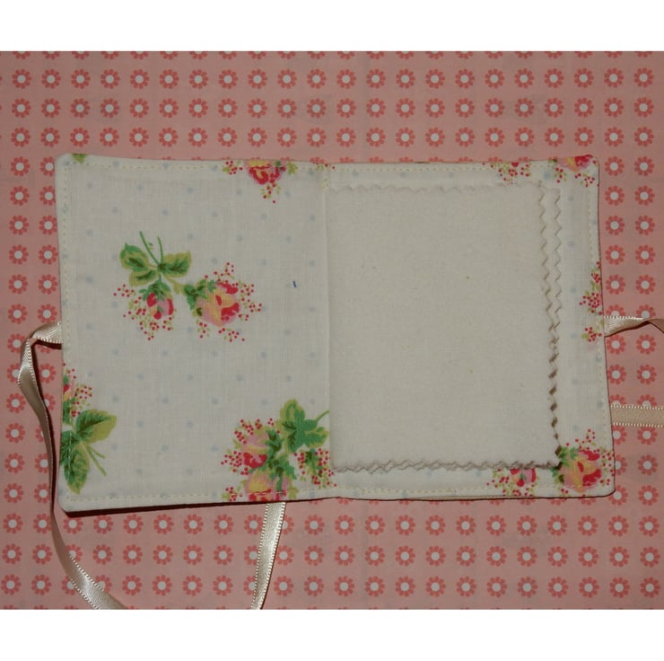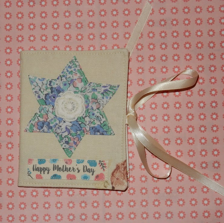 This pretty needle case measures approx 4.5 x 3 inches and is made from a woven fabric, with a Liberty print patchwork star, and lace flower appliqued on, and a ribbon reading "Happy Mother's Day". It is lined in toning cotton fabric and has four flannel leaves for your pins and needles. It is fastened with ribbon ties, which can be tied right round the case for protection in a bag.
