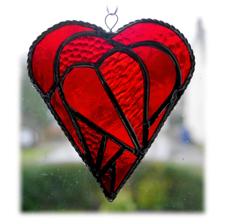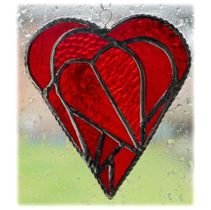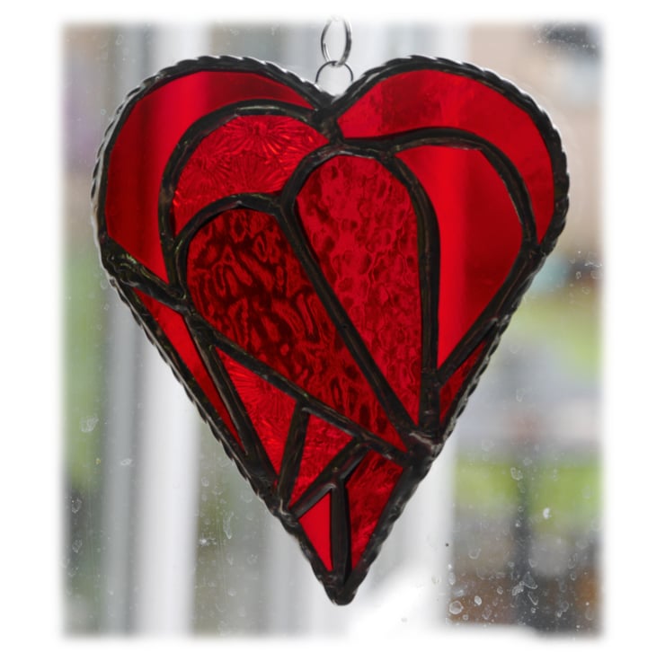 It's a three heart design, each one inside the other and made entirely from red glass but using several different shades and textures.