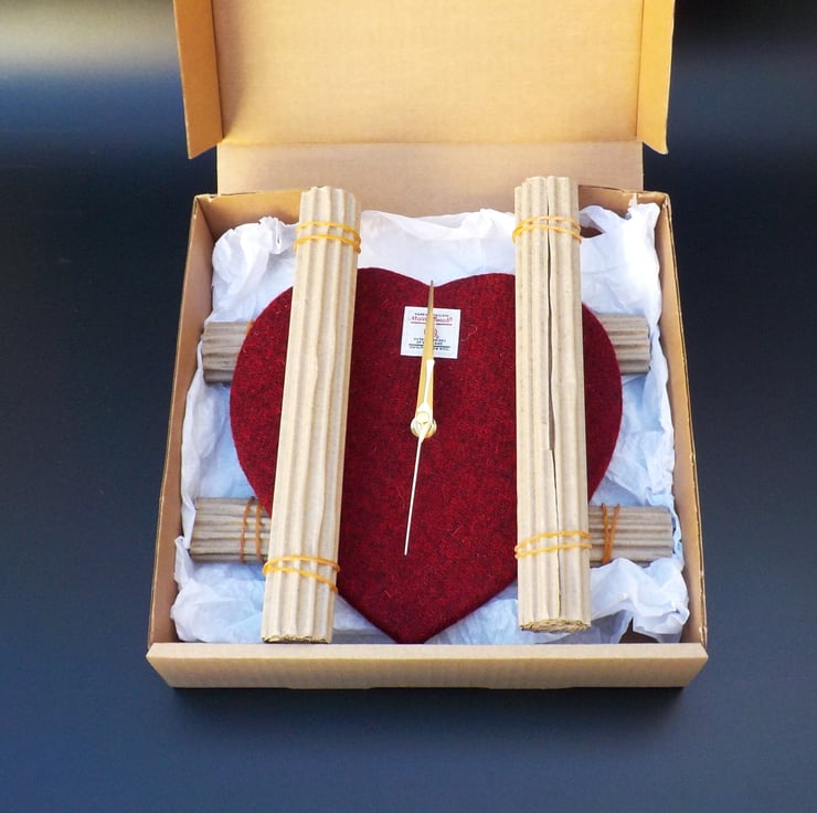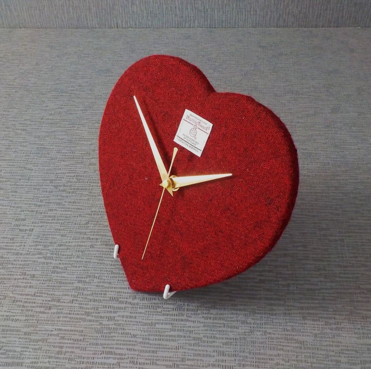 Here's something different! I have designed and created this unusual heart shaped clock using the world renowned Harris Tweed hand-woven wool fabric. This one is a mottled deep wine red. The "12 o'clock" position is marked by the "Orb" label, your guarantee of genuine Harris Tweed.
