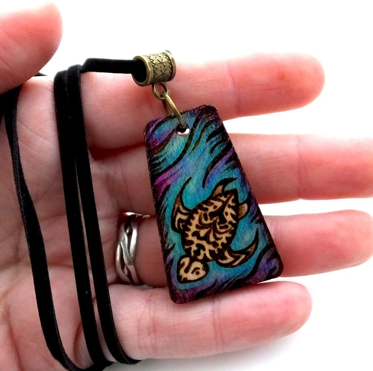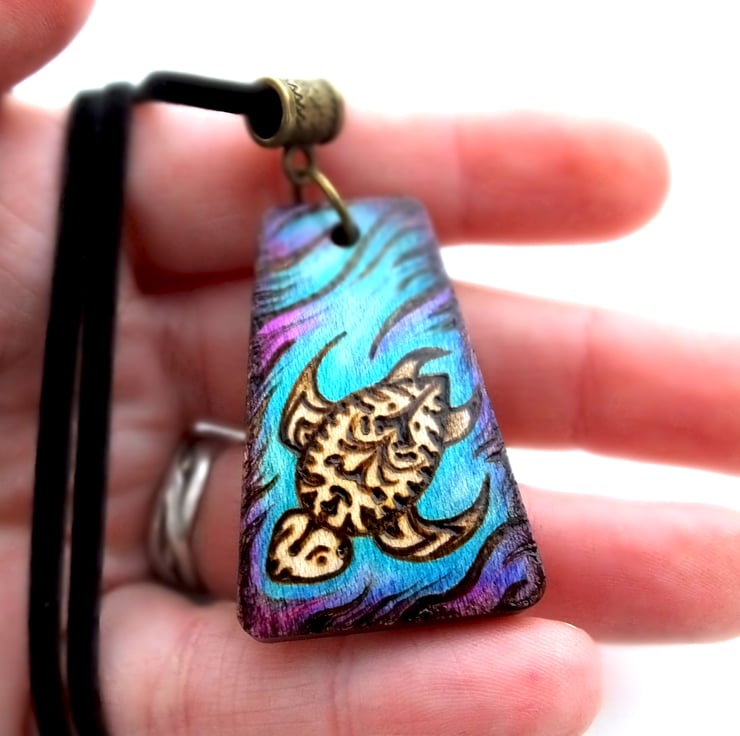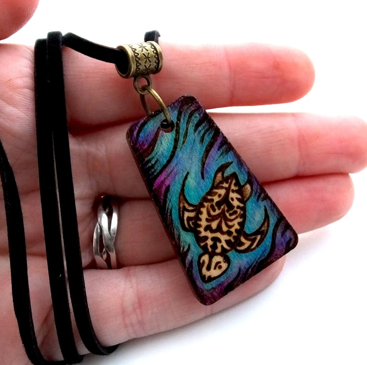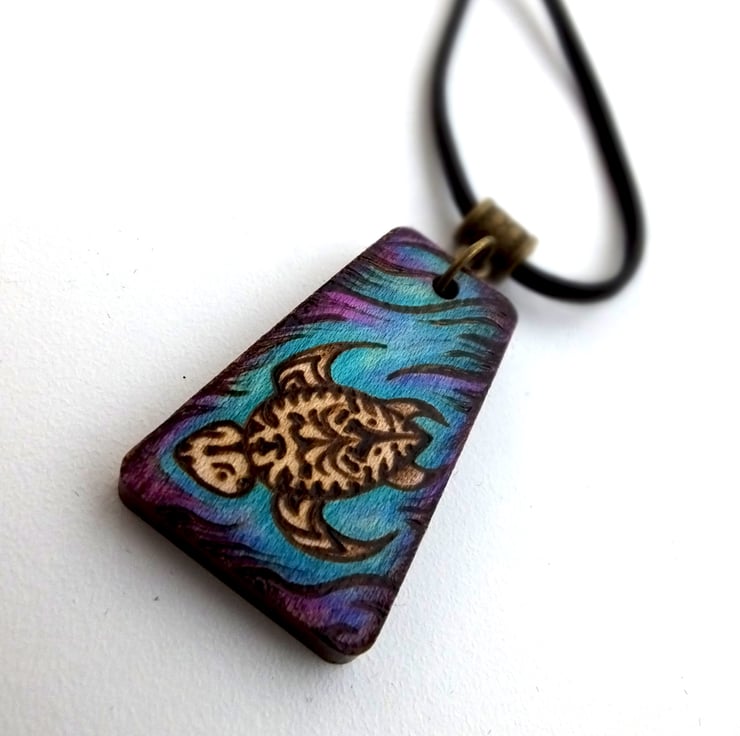This listing is for a beautiful wooden tribal patterned turtle pendant, with a watery marine background, created using pyrography, prismacolor pencils and ink. The wood is maple and the pendant is varnished to protect the design.