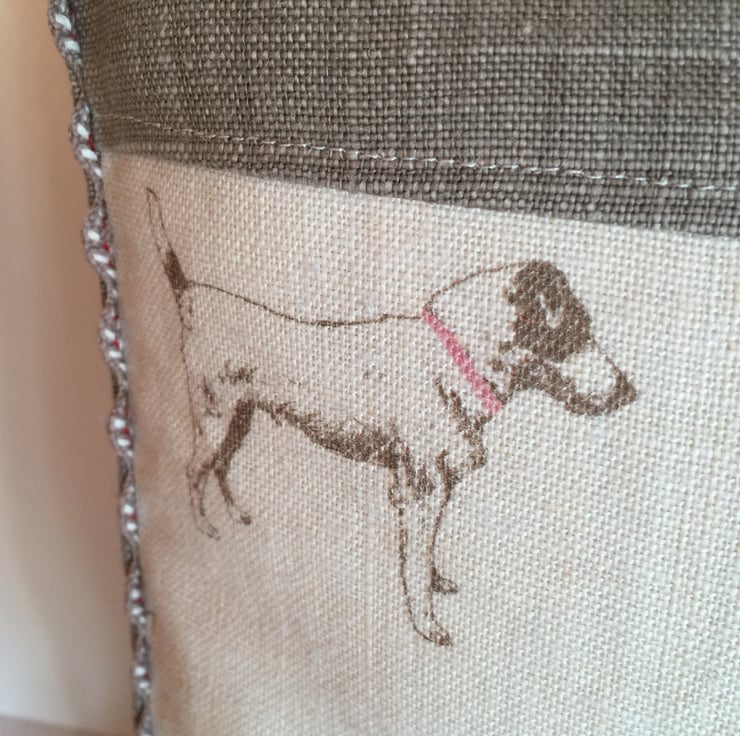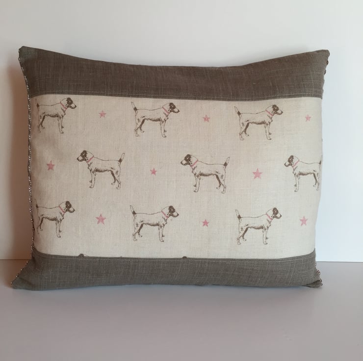 An attractive panelled cushion featuring little terrier dogs, that would look perfect nestled in a chair in any room within your home. It has been constructed using beautiful quality linens.All seams have been overlocked and the two short sides have been edged with a decorative ric rac braid.