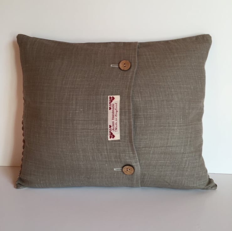It has a deep envelope closure which fastens with two coconut shell buttons.The cushion comes complete with a feather filled insert.