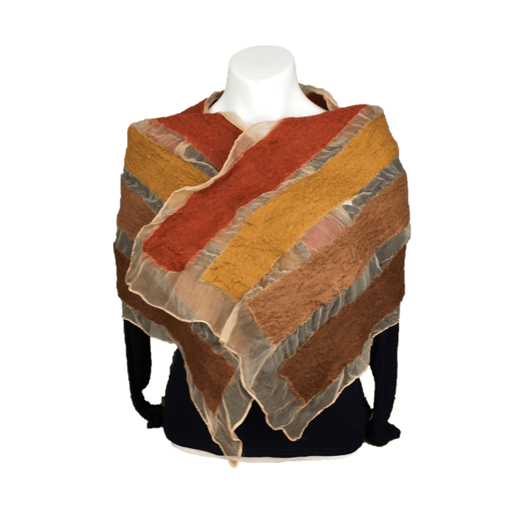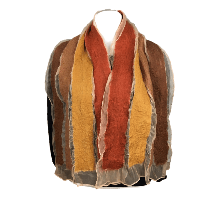 This beige coloured silk chiffon scarf has had stripes of various shades of brown merino wool nuno felted to both sides. Gaps between the stripes allow the chiffon to show through. Nuno felting causes the woollen fibres to migrate through the silk and bind with it. Shrinkage of the wool fibres during the felting process gives a gathered effect to the silk chiffon as illustrated in the fourth photograph.