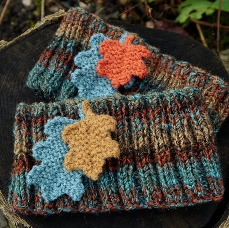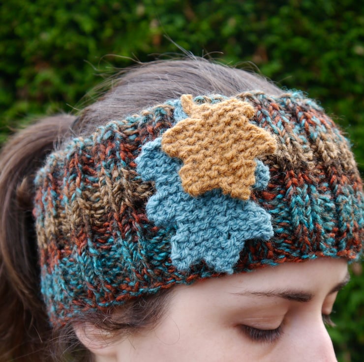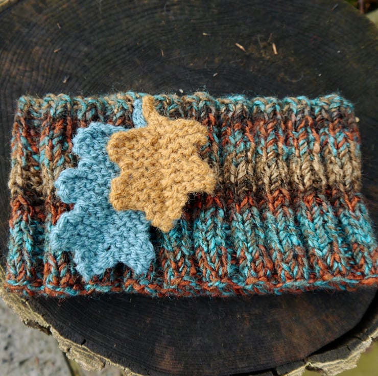 A lovely chunky ribbed ear muff. I have attached two hand knitted oak leaves in contrasting colours. Made with a marble effect good quality warm chunky yarn. I have knitted this on a circular needle so there are no seams. The ribbed effect means that it is very stretchy and will fit most head sizes, from child to adult. It measures approx. 9cm deep and is about 40cm around when not stretched. There are other colours available in my shop (please see photos).