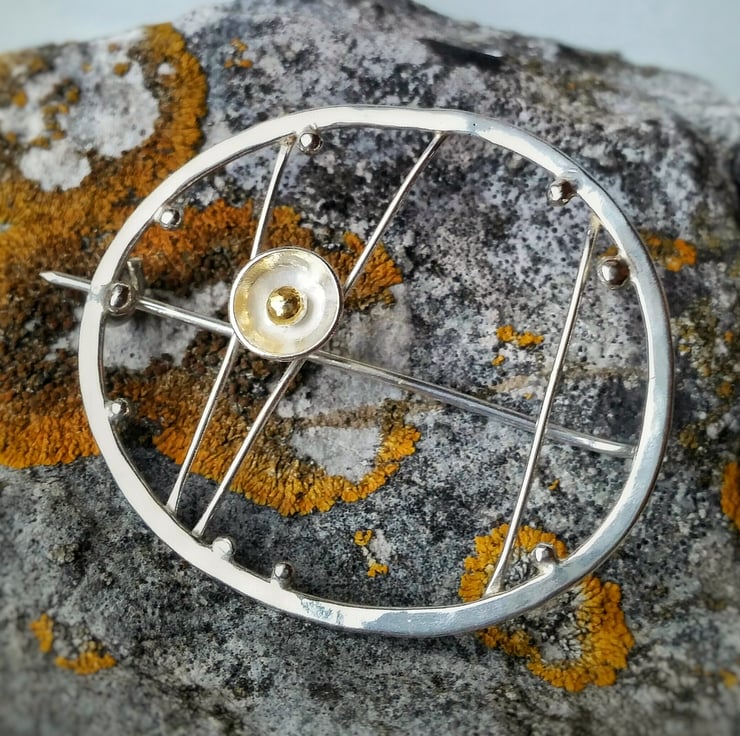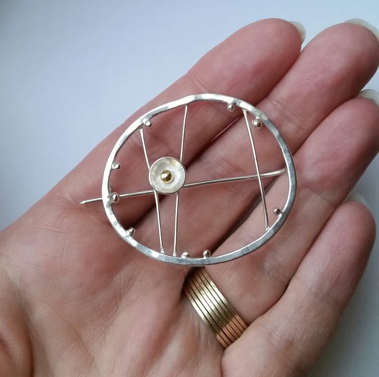 This unusual larger brooch is handmade from sterling silver and has an irregular organic feel. Inspired by nature, especially Lichen, I have used these shapes,textures and colours as the inspiration for this quirky brooch. In the middle of the little silver cup I have added a small silver ball accented with 24 ct. gold for a rich twist.