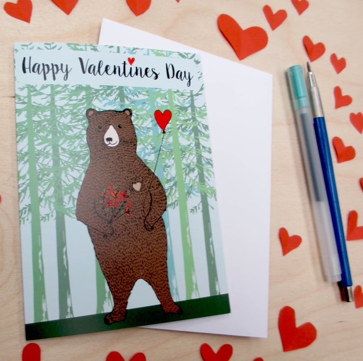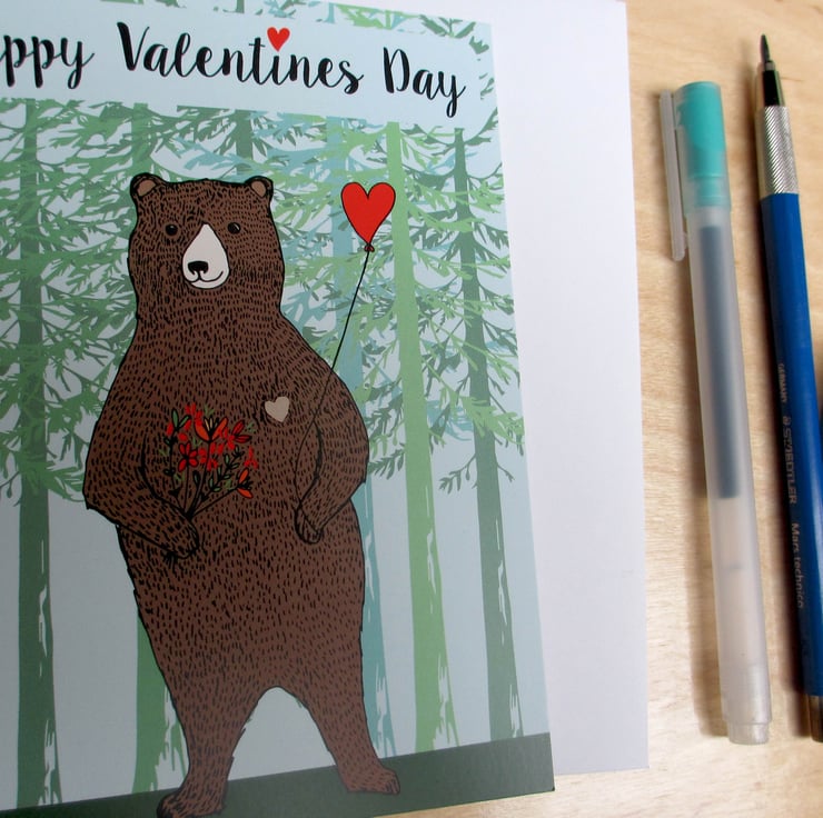 Originally drawn by hand, this illustration is a drawing of a bear walking through the woods with valentines presents.