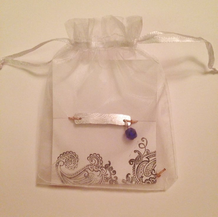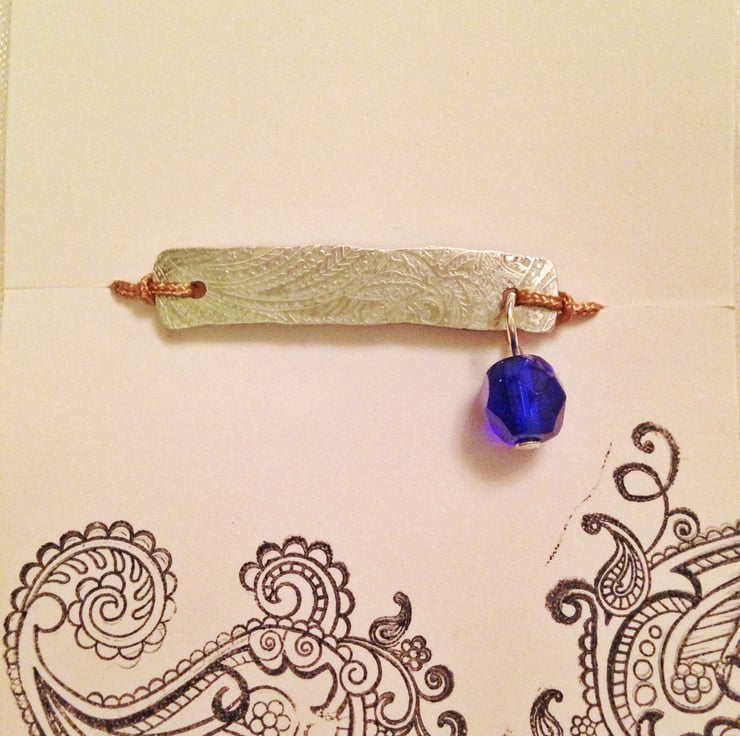 Hand textured and stamped Aluminium friendship bracelet with a blue glass bead on a adjustable bracelet all in a little gift bag