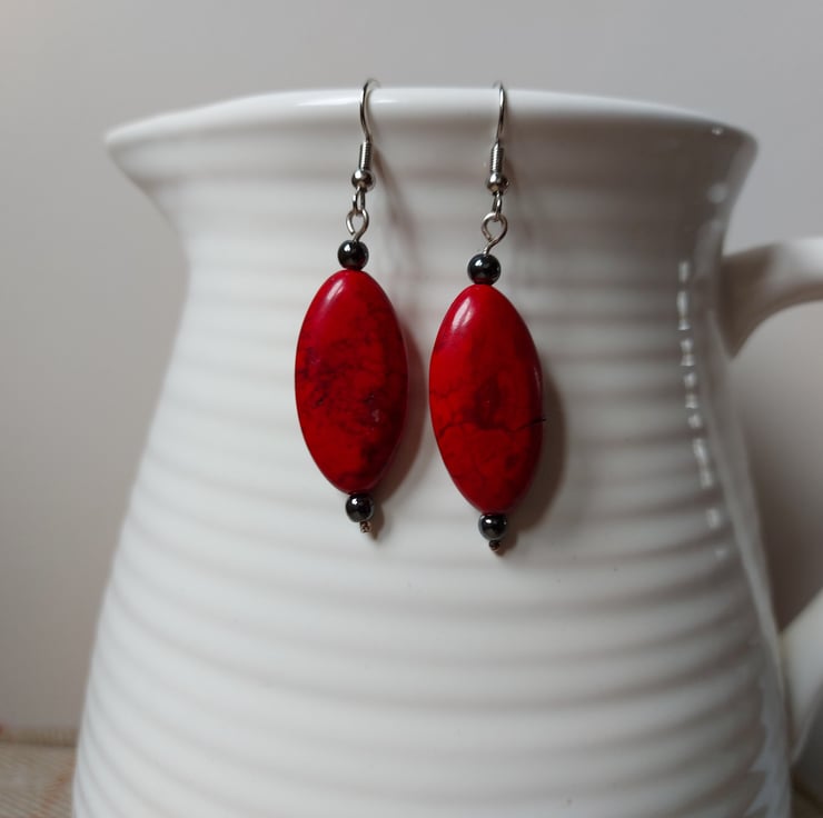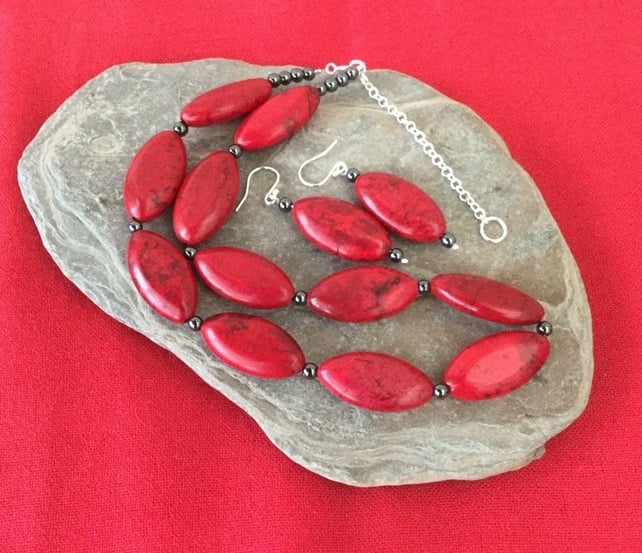 The matching drop earrings are available separately from the drop earrings section of my Folksy shop. Each has a single red magnesite bead and two of the small haematite beads mounted on a sterling silver head pin and suspended from a hook stamped .925 to indicate sterling. The drop below the hook is about 4cm.