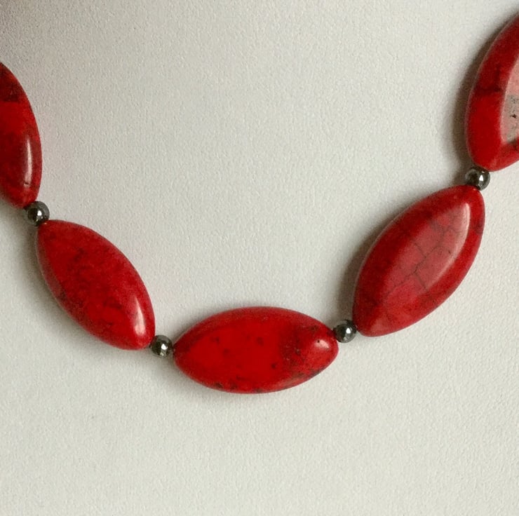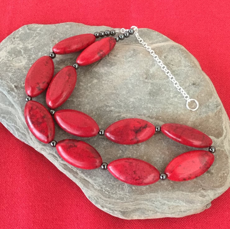 This statement necklace features sterling silver findings with chunky gemstone beads of red magnesite and small round beads of glossy dark grey haematite. The boat-shaped marquise beads are about 3cm, 1.2inches in length, a bright rose-hip red in colour with dark veining. They have a lovely smooth curved surface with a satin sheen. The length of the necklace is 40cm, 16 inches, and I have added a 5cm sterling silver extension chain allowing you to vary the length as you wish. The necklace is secured by a sterling silver bolt ring clasp.