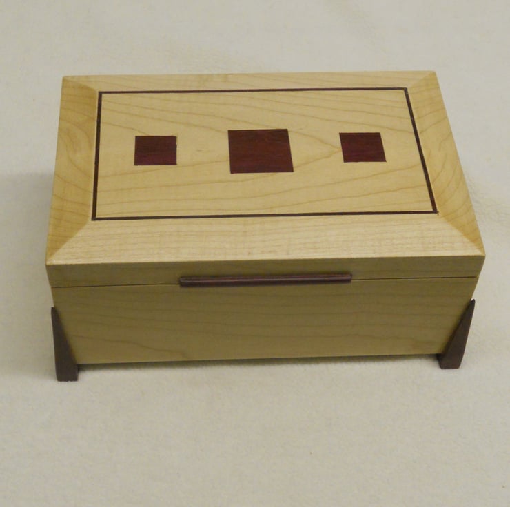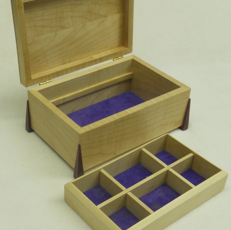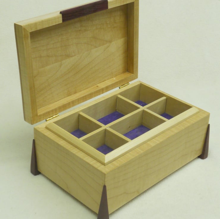 A newly designed solid sycamore Jewellery box handmade in an Art Deco style with purpleheart inlay, lift bar and legs. It has a lift- out partitioned tray and lined in a suede-like lavender coloured material.