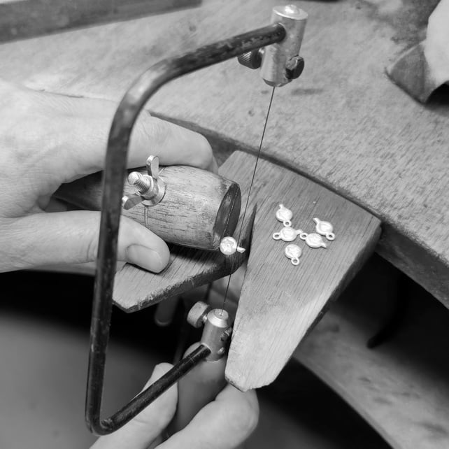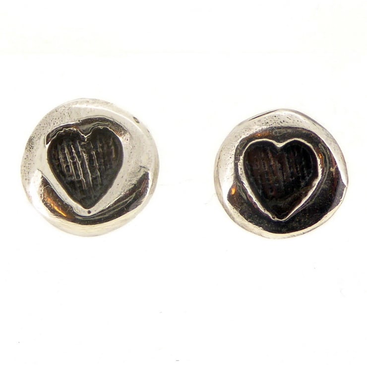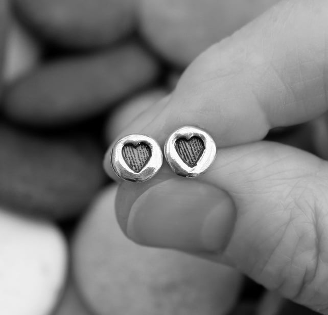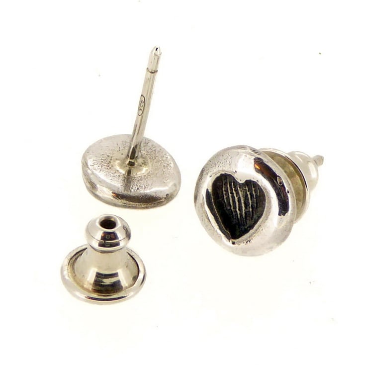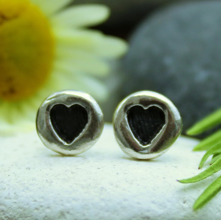 These little heart ear studs have been made by us in our workshop in Yorkshire. They are made from sterling silver and measure 8mm in diameter. We designed the heart punch that has been deeply embossed into the silver, the ear studs have been oxidised and then highly polished to create a strong contrast against the black hearts. The posts and ear backs are made from sterling silver.