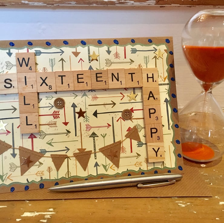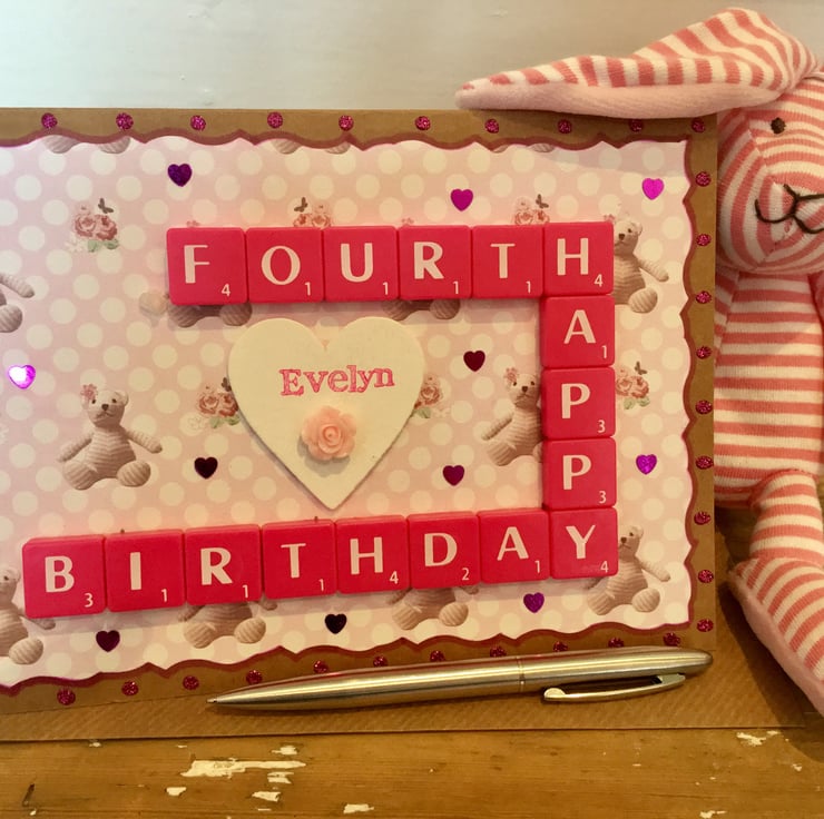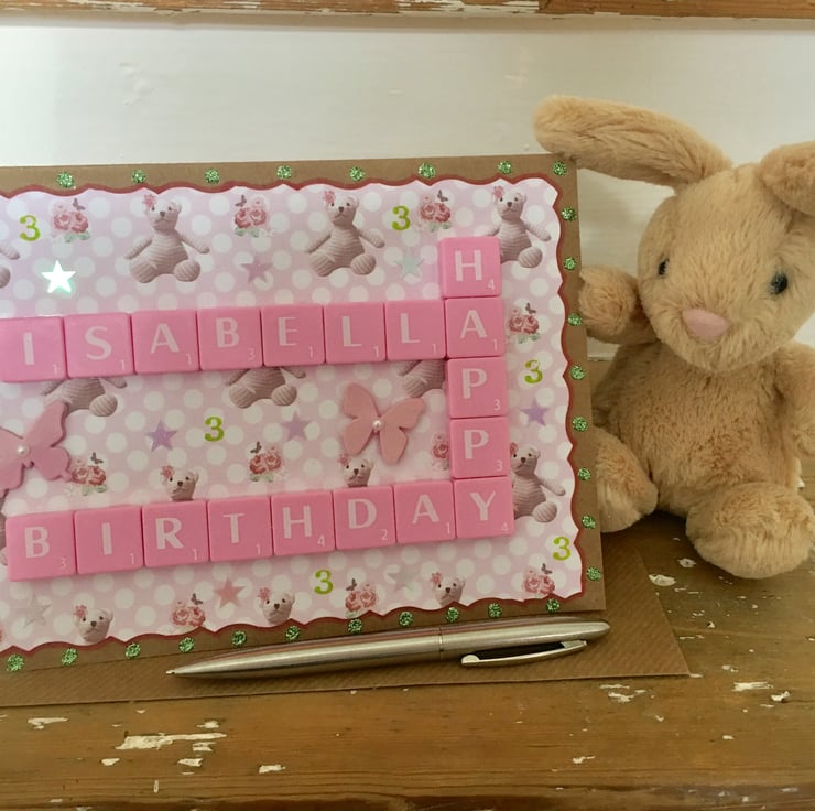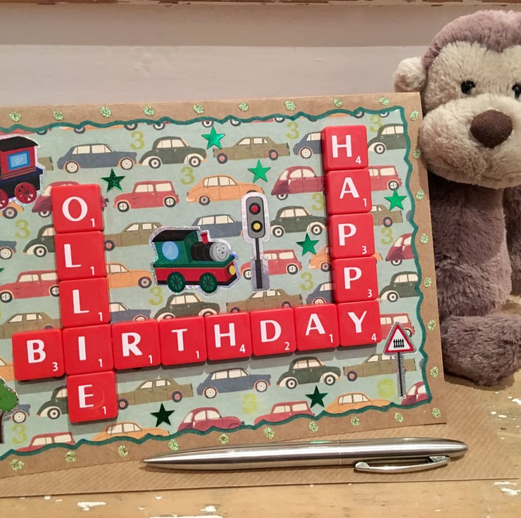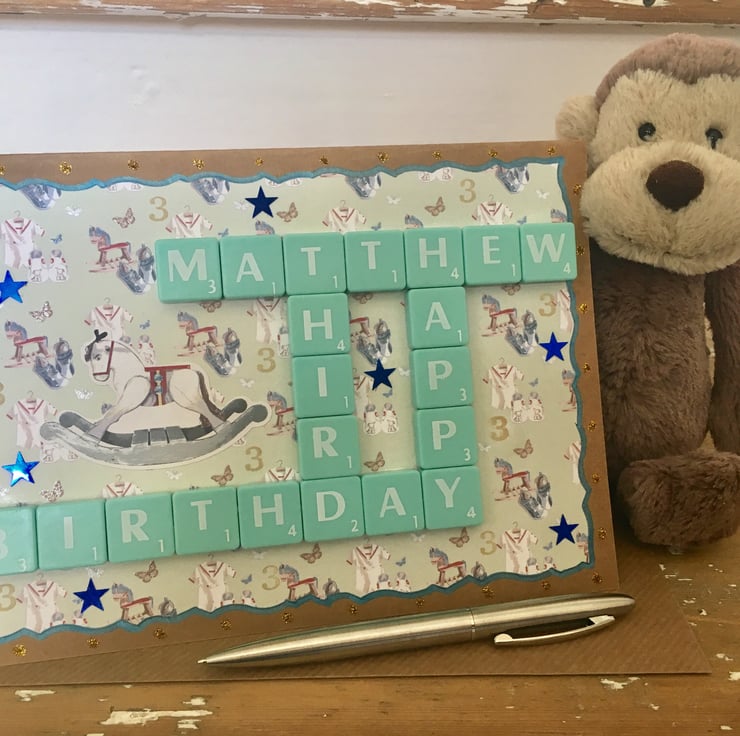 Bespoke handmade Scrabble letter A5 children's birthday cards personalised to meet your requirements, crafted using top quality Kraft card. Cards are blank on the inside for your own message. The maximum number of letters that can be accommodated horizontally is 9, and vertically; 6. Tiles come in the following colour choices; black, white, ivory, baby pink, hot pink, red, purple, baby blue, vintage green or natural wood. A vast number of background card choices are available in numerous colours and designs; please contact me with your requirements to make your design truly unique!