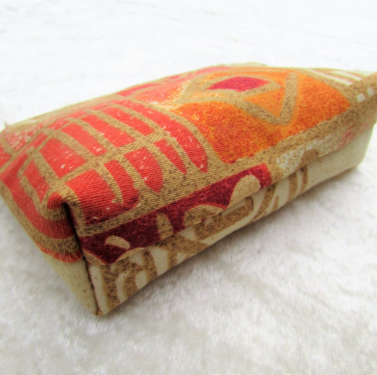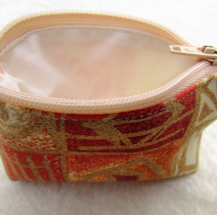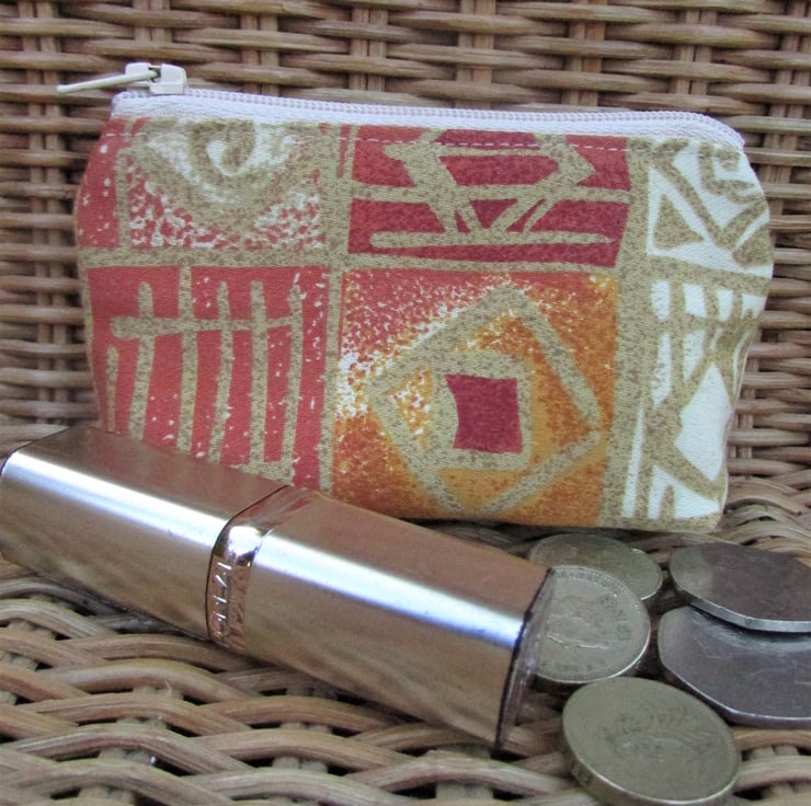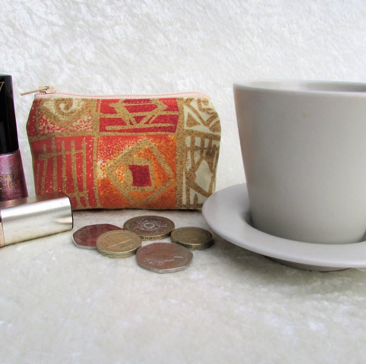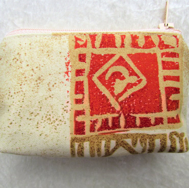 A cute small purse in a lovely abstract print fabric in warm shades of cream, red, terracotta and gold. The purse has a matching cream zip and is lined with cream fabric. The base of the purse is boxed to give extra room inside.