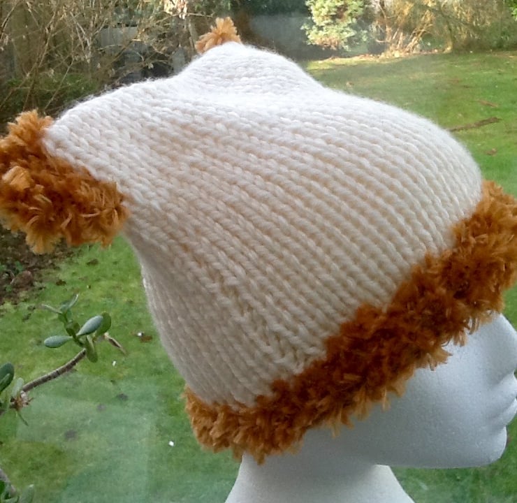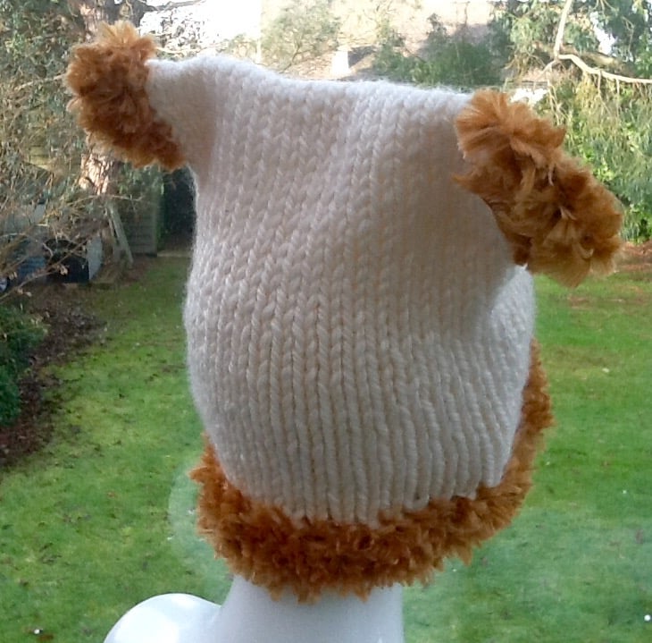 The cream yarn for the knitted portion of the hat, has been knitted in simple knit and pearl columns, this yarn is a thick wool and acrylic blend yarn, so soft and warm. The Golden yellow eyelash yarn used for the ears and around the edge of the hat is 100% acrylic.