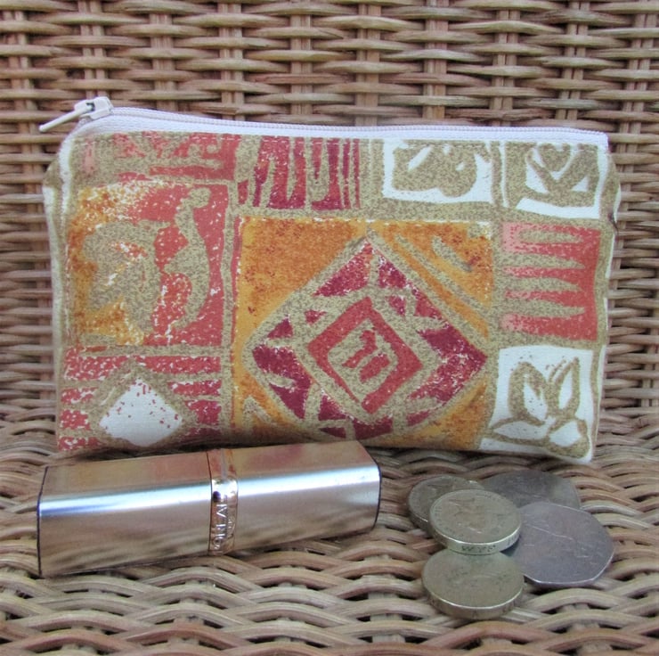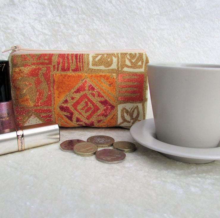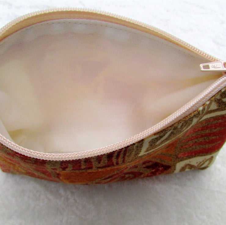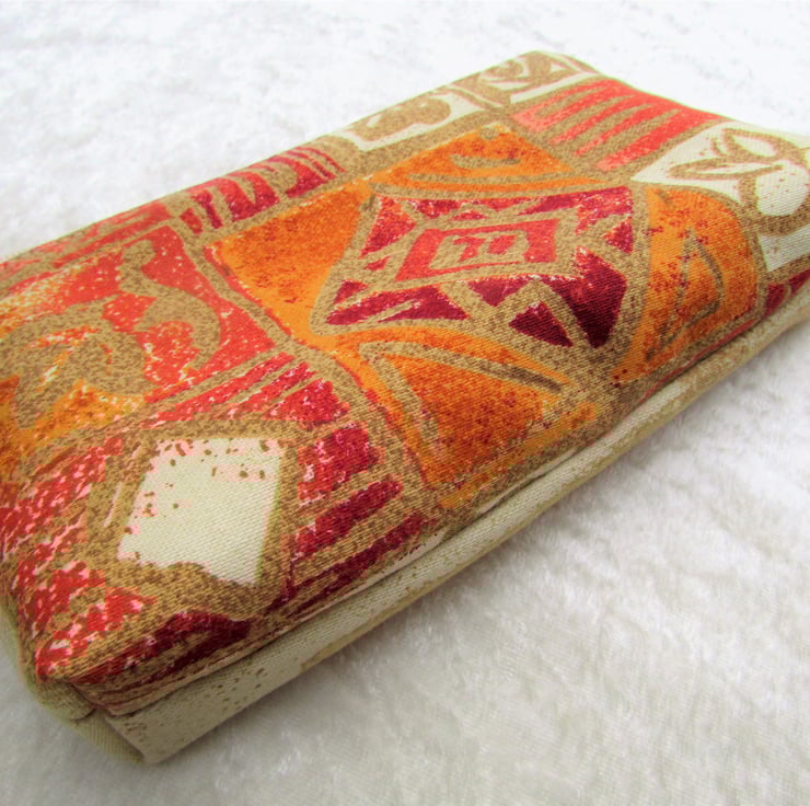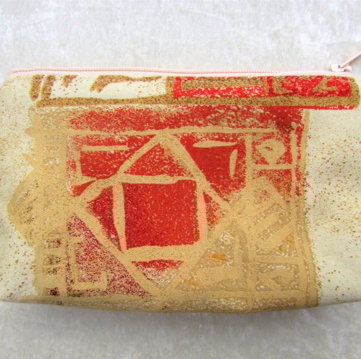 A large purse in a striking abstract print fabric in warm shades of cream, terracotta, red and gold. The purse has a cream zip and is lined with cream fabric. The base of the purse is boxed to give extra room inside.