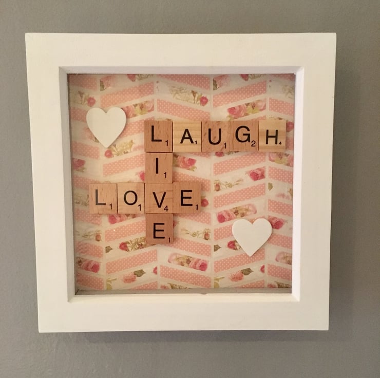 Bespoke handmade Scrabble letter mini (6") 'life' pictures personalised to meet your requirements, crafted using top quality materials. The maximum number of letters that can be accommodated horizontally and vertically is 9. Tiles come in the following colour choices; black, white, ivory, baby pink, hot pink, red, purple, baby blue, vintage green or natural wood. Frames are available in white, baby blue, baby pink, distressed or natural wood. A vast number of background card choices are available in numerous colours and designs; please contact me with your requirements to make your design truly unique!