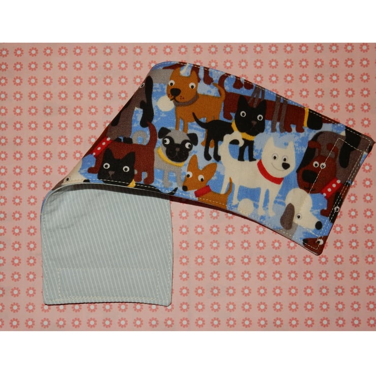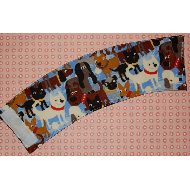 A fun travel mug cosy designed to fit travel mugs similar to the one in the photo (mug not included), made from fabric featuring quirky dogs. It is approximately 3.25 inches deep and fastens with Velcro. It is reversible with a striped fabric on the reverse, and a layer of cosy wadding.