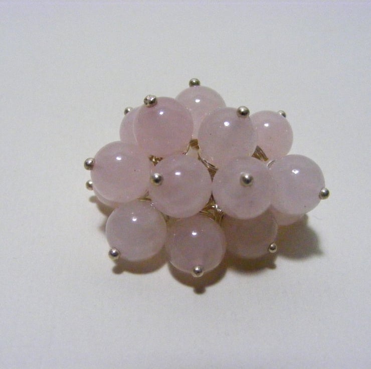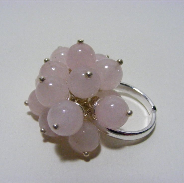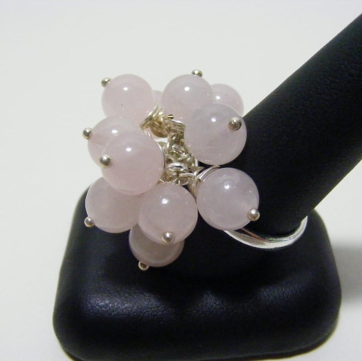 Ring is made with 8 mm rose quartz round gemstones which are threaded onto silver plated ball headpins and wrapped onto a 3 loop silver plated adjustable ring finding.