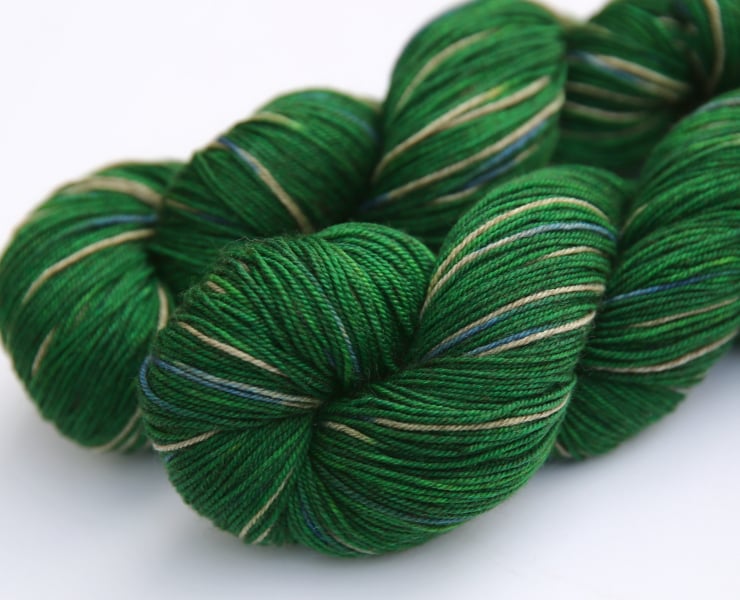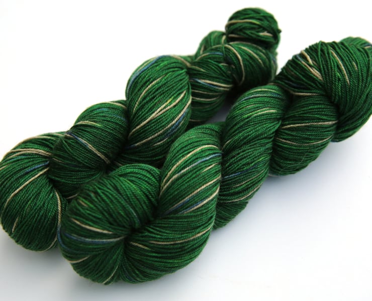 Bottle green with a short, regularly repeating section of the natural pewter-grey colour of the yarn and a hint of blue. This is a 4-ply weight yarn with a a versatile superwash merino base, with cosy, soft yak fibre and a little nylon for strength. The natural grey colour of the Yak gives the colours beautiful richness and depth. There are two skeins available (price shown is for one). One skein has a slightly longer grey section than the other, so if you plan to use both in the same project, alternating skeins as you work is recommended. Photos taken and edited in bright natural light.