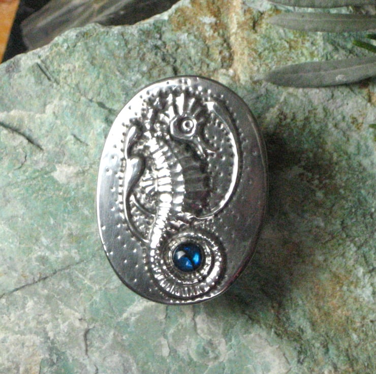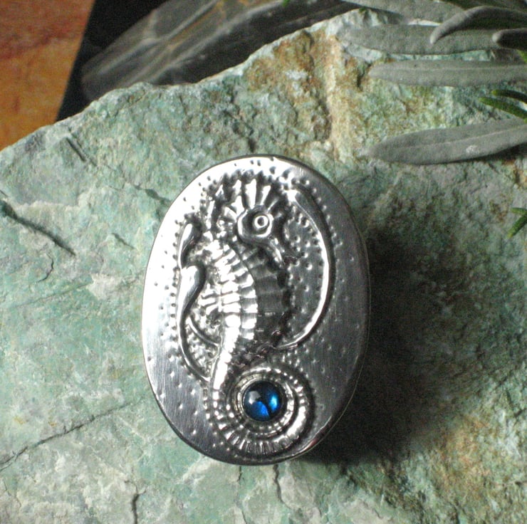 Seahorse brooch handmade in pewter in the Arts and Crafts tradition, set with a beautiful blue paua shell cabochon.