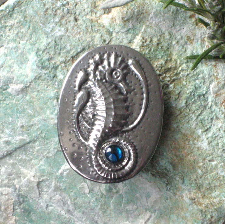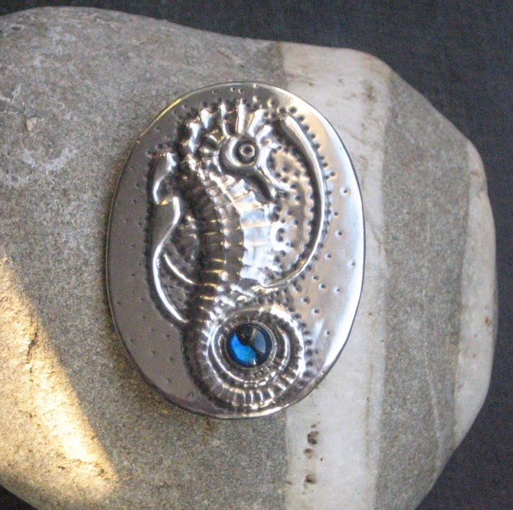 This shiny seahorse brooch has been handcrafted in the UK, using sheet pewter which has been embossed and mounted on an aluminium base.