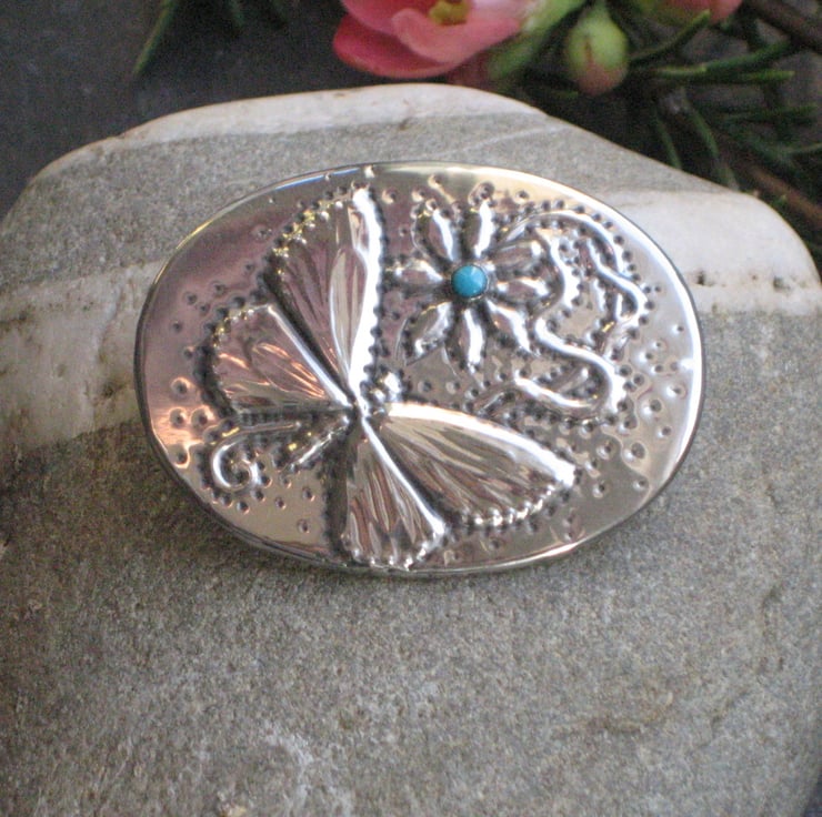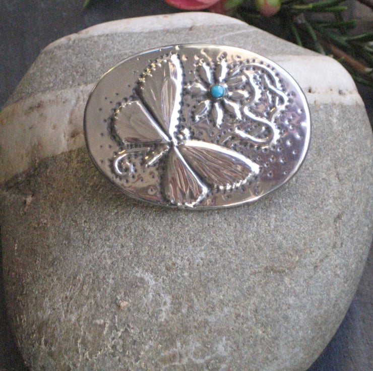 Vintage style butterfly brooch hand made in pewter with turquoise stone. This pretty oval butterfly brooch has been made in vintage Art Nouveau style in sheet pewter.