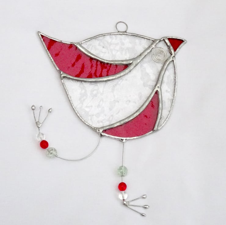 This has been made from red textured glass and clear florentine glass for the body and orange glass for the beak. Each piece of glass has been copper foiled and soldered together with a generous bead on the joints for add strength. Legs and feet have been made from tinned wire and glass bead threaded on.