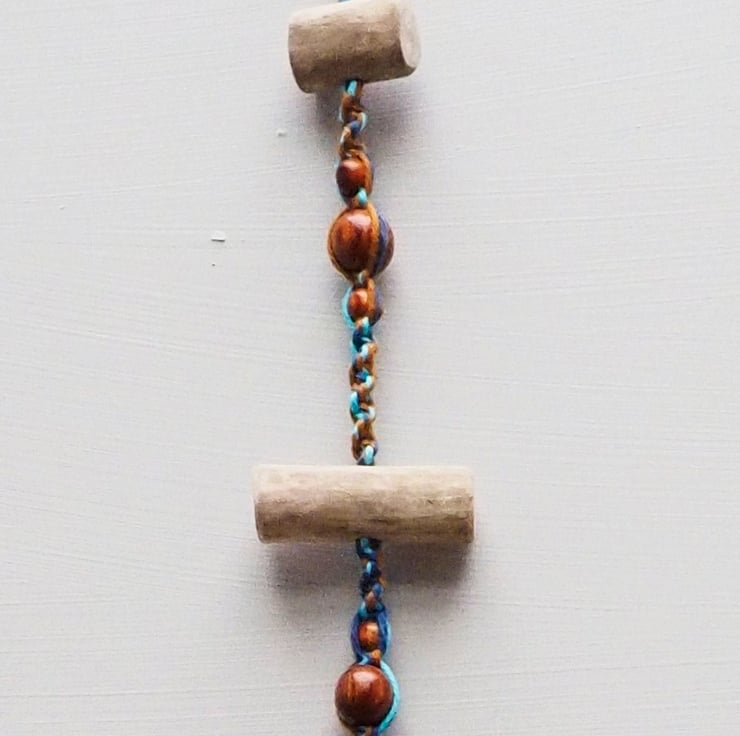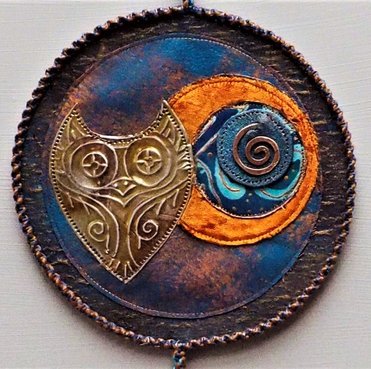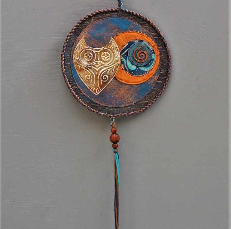 15cm roundel, hand painted fabric wall hanging plus macrame loop and danglers with wooden beads and driftwood. Original Owl design on embossed metal (recycled drinks can) stitched to a painted fabric background and velvet. Full length approx 80cm but can easily be cut shorter. I make these with my sister Mandy at Thrifty Drifter.