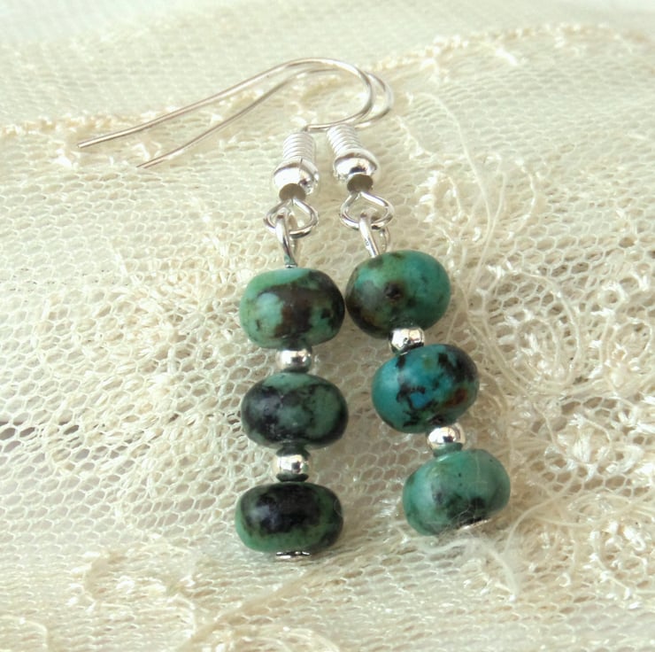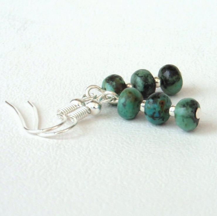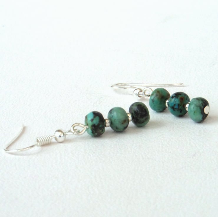 Three pretty turquoise rondelles hang from silver plated wires along with two little silver coloured beads.