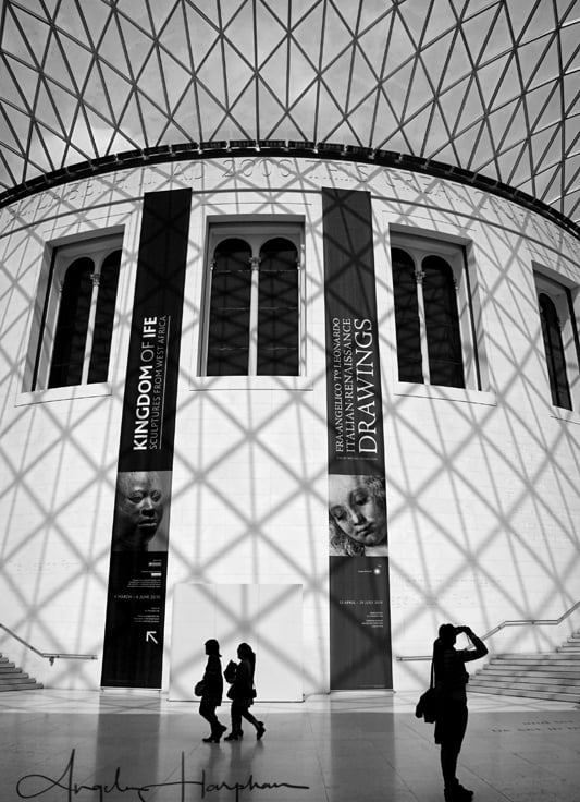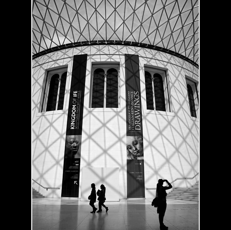 A visit to London including the British Museum left me inspired by this building and the wonderful glass roof. I loved the juxtaposition of the one person standing looking out of the frame to the right and the two walking out of the frame to the left. That combined with the shadows of the atrium and the banners made an interesting composition.