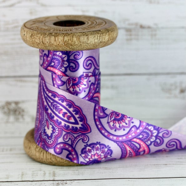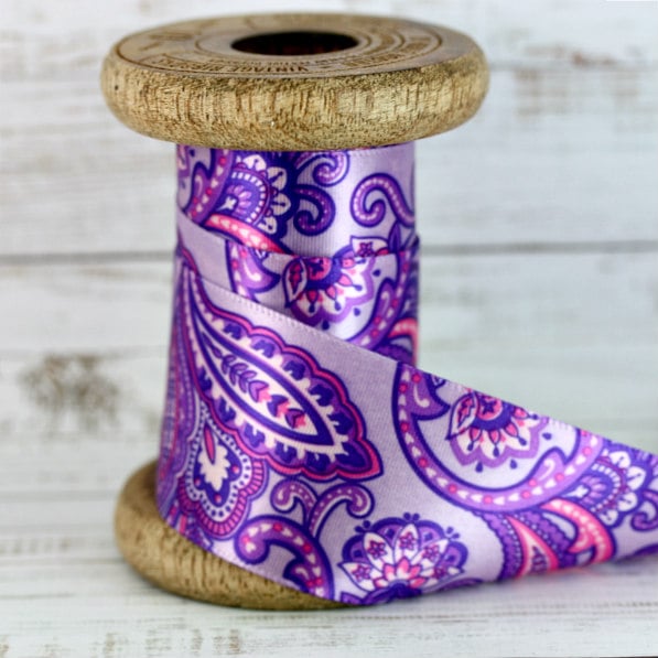Gorgeous Lilac French Paisley Satin Ribbon, the ribbon has a lovely luxury feel. Design printed on one side only.