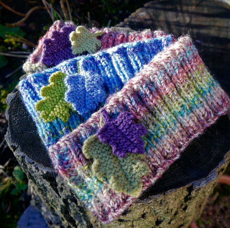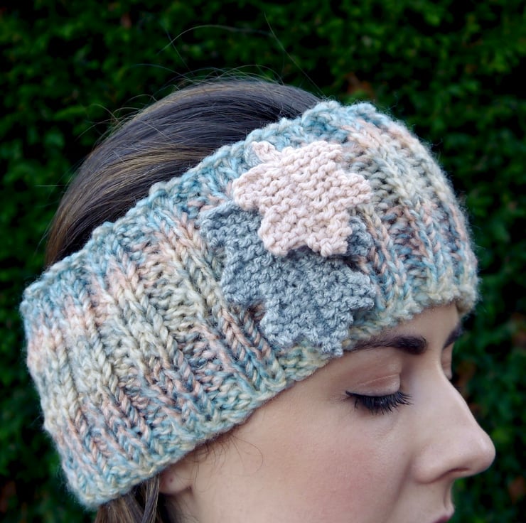 A lovely chunky ribbed headband in pale pastel shades. I have attached two knitted oak leaves in contrasting colours. Hand knitted with a marble effect good quality warm chunky yarn. I have knitted this on a circular needle so there are no seams. The ribbed effect means that it is very stretchy and will fit most head sizes, from child to adult. It measures approx. 9cm deep and is about 40cm around when not stretched. There are other colours available in my shop (please see photos).