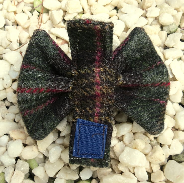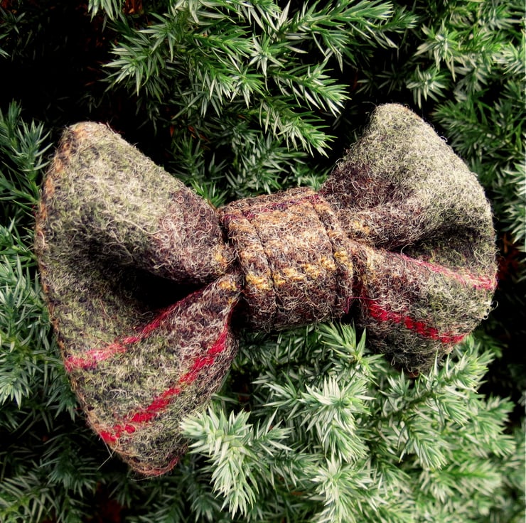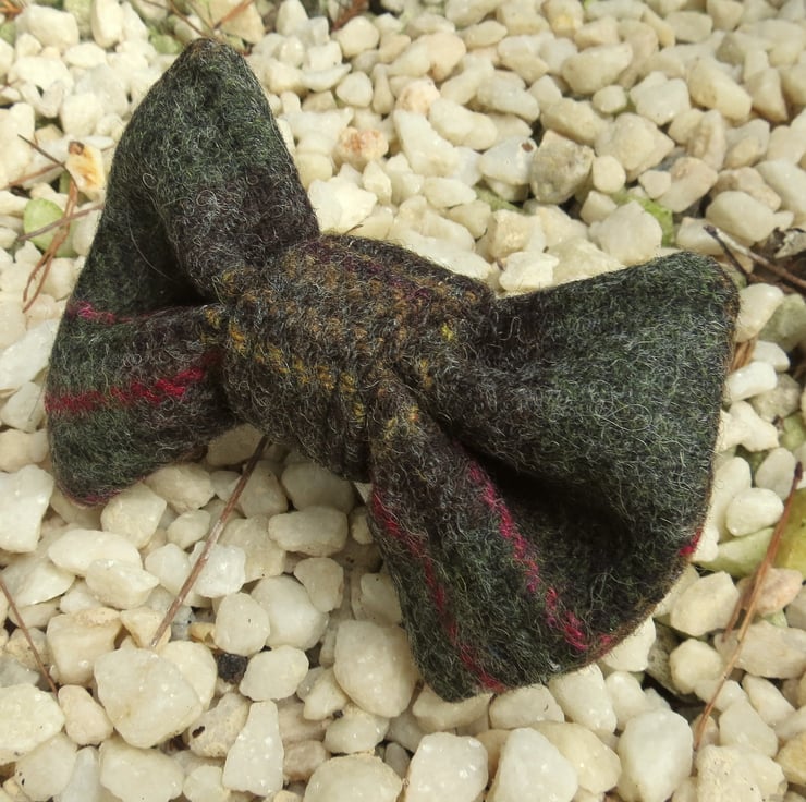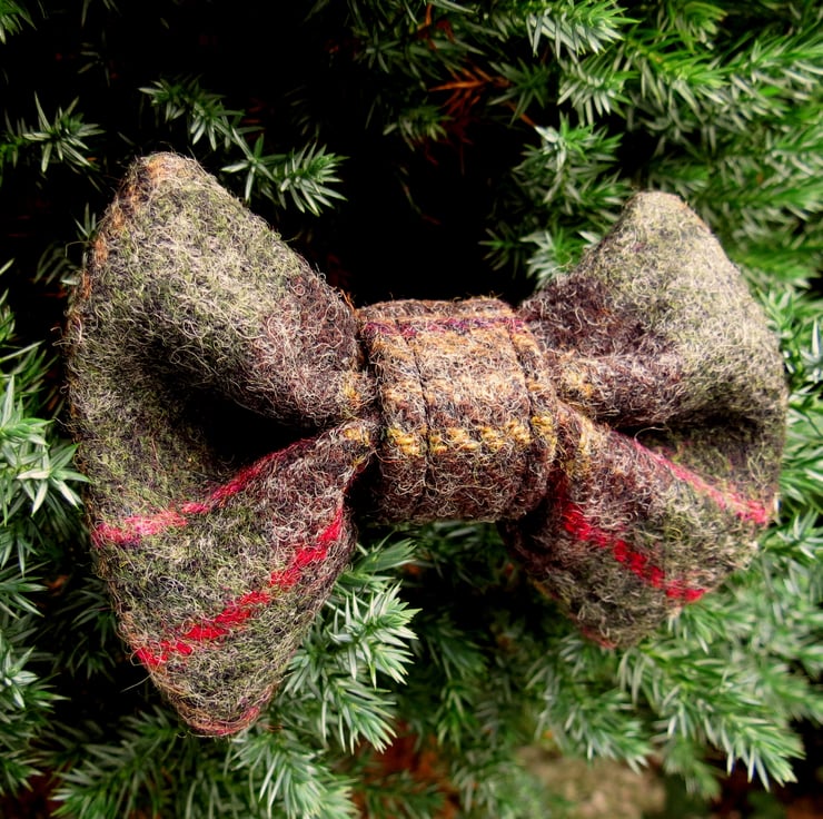 This bow tie is made from a dark green tartan wool, with ochre and red accents.