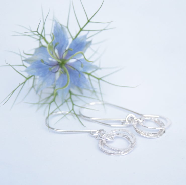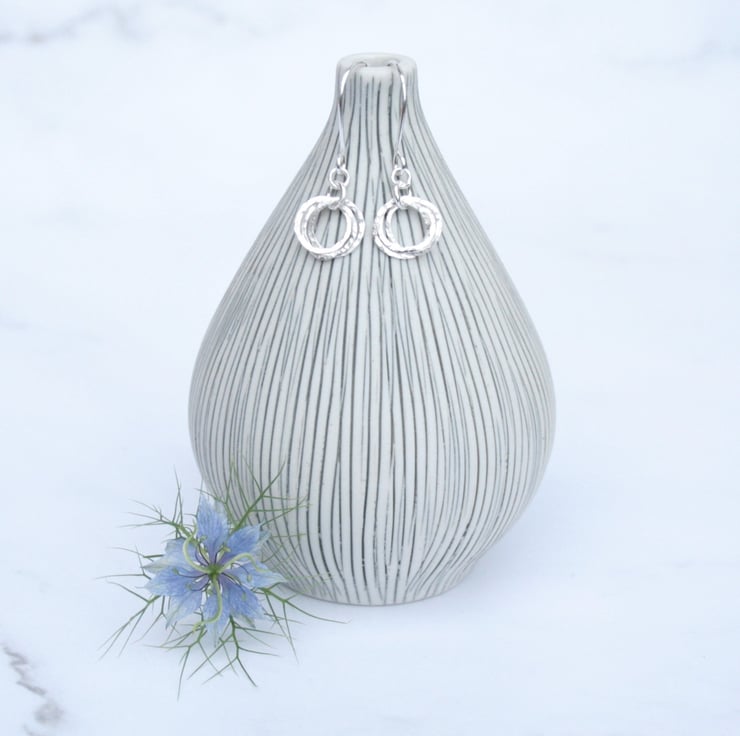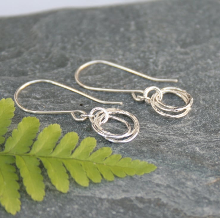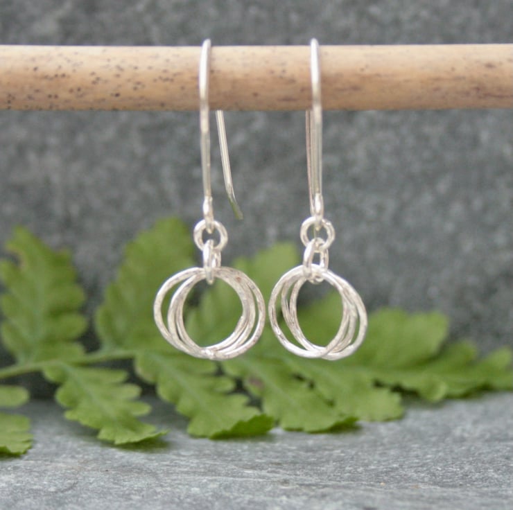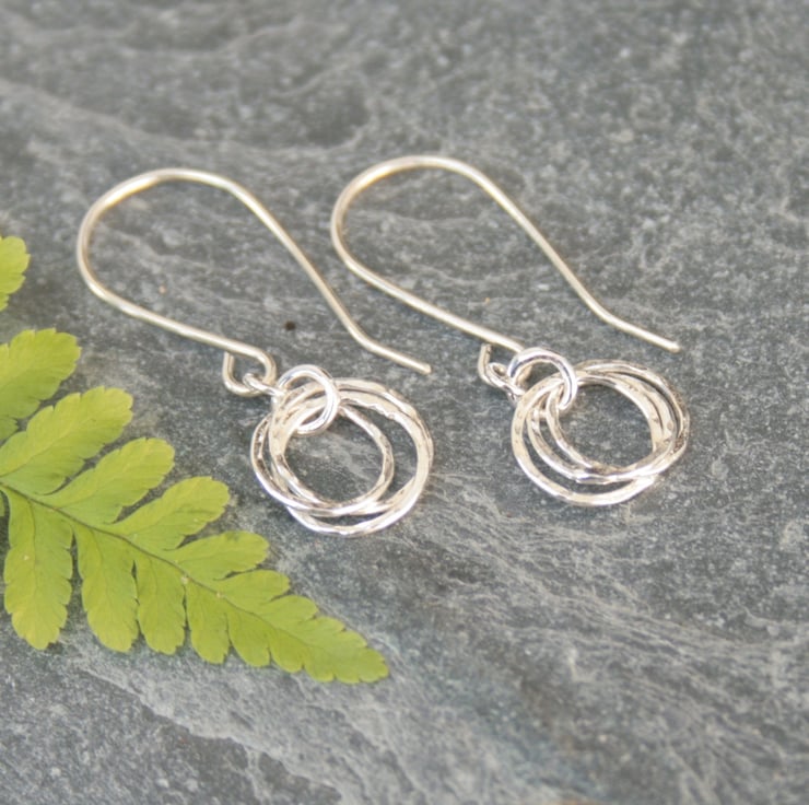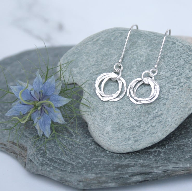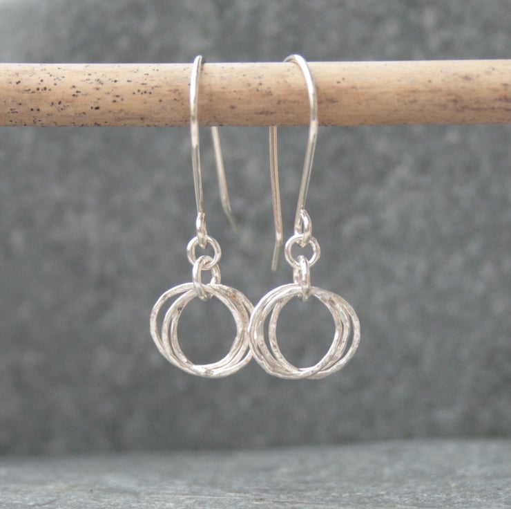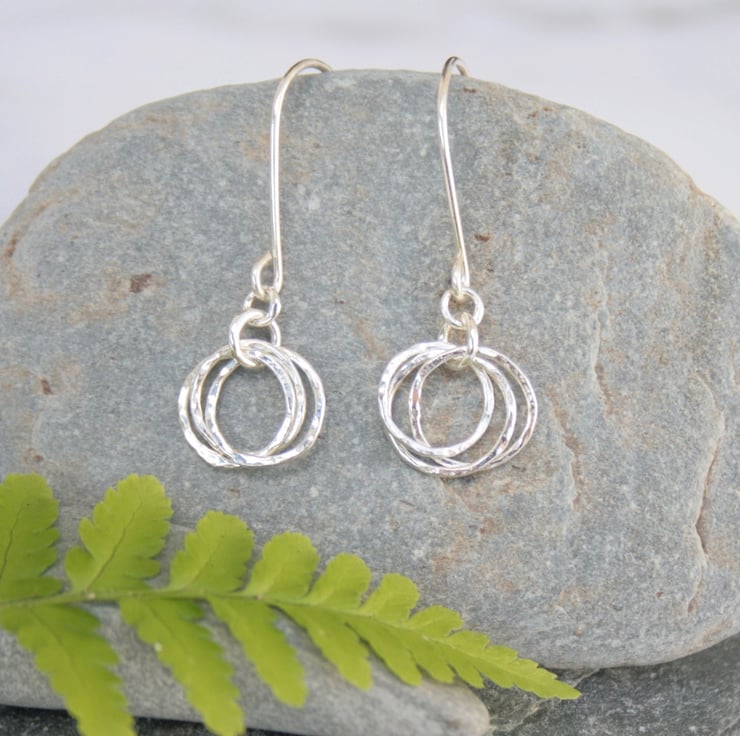 These earrings were made by interlocking three rings which have been gently hammered to add texture and they then hang from sterling silver ear wires. The circles have a diameter of approximately 10mm and the total drop from the top of the ear wire to the bottom of the circle is around 28mm.