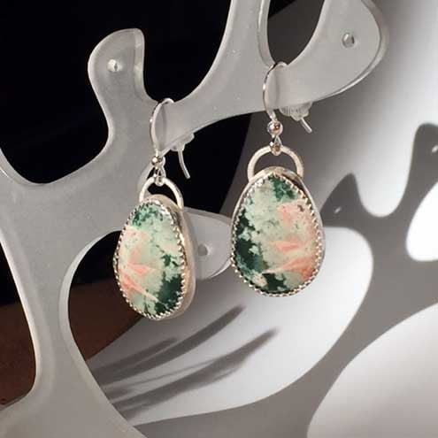 Beautifully cut and polished stones and a matching pair that make pretty earrings. These Jasper stones have lovely patterning of pale pink, dark green and soft grey colours. The stones have been set in fine silver serrated bezels on a sterling backplate and the earwires are sterling silver. The serrated bezel wire adds a subtle sparkle to these pretty, unique, and very wearable earrings.