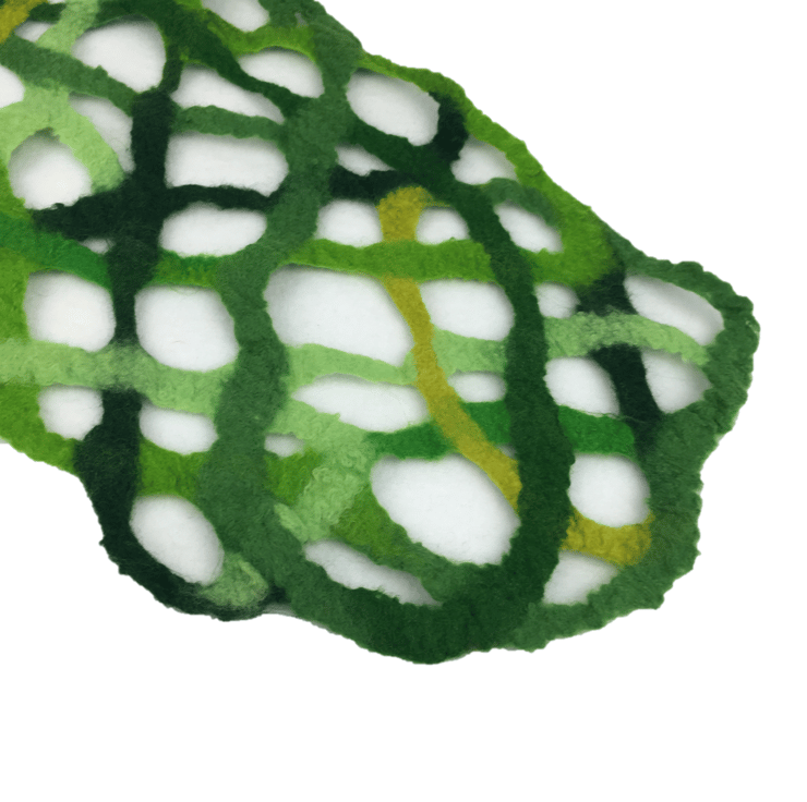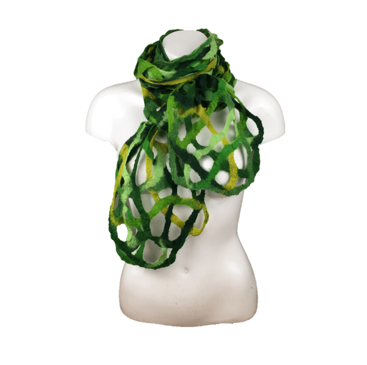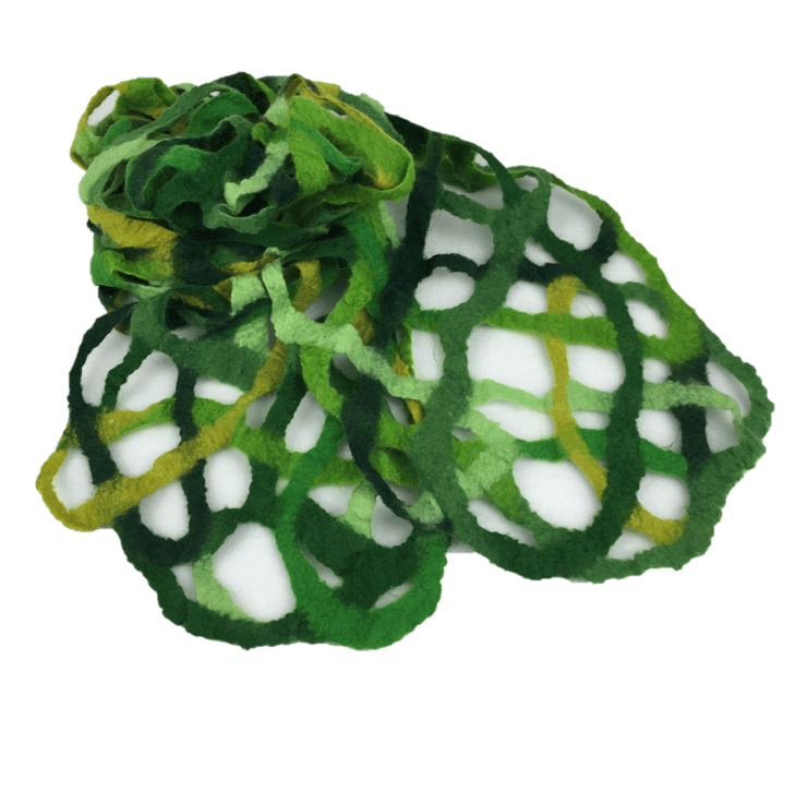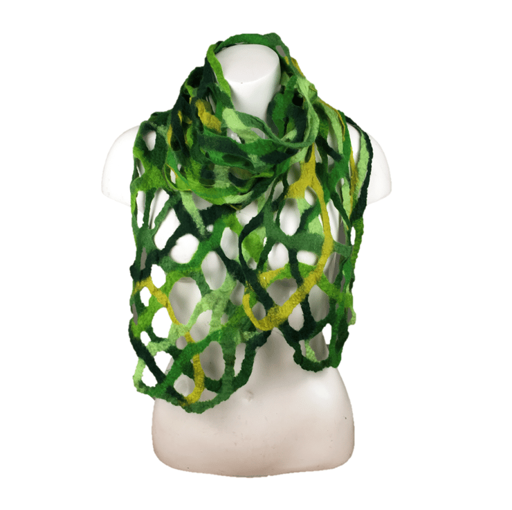 Various shades of green merino wool fibre have been used to create this beautiful scarf. The fibres have been laid out in a random open lattice pattern.