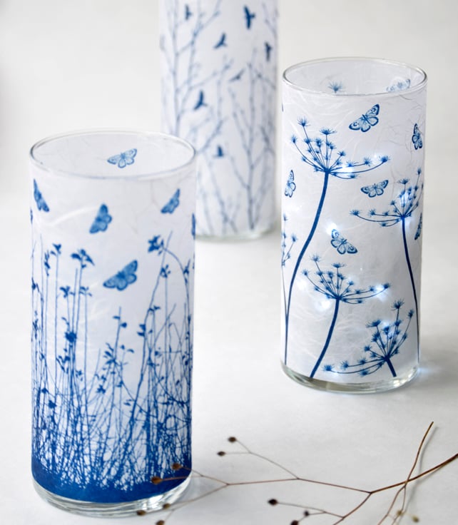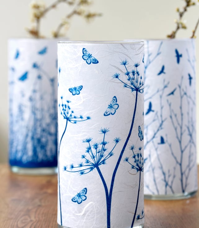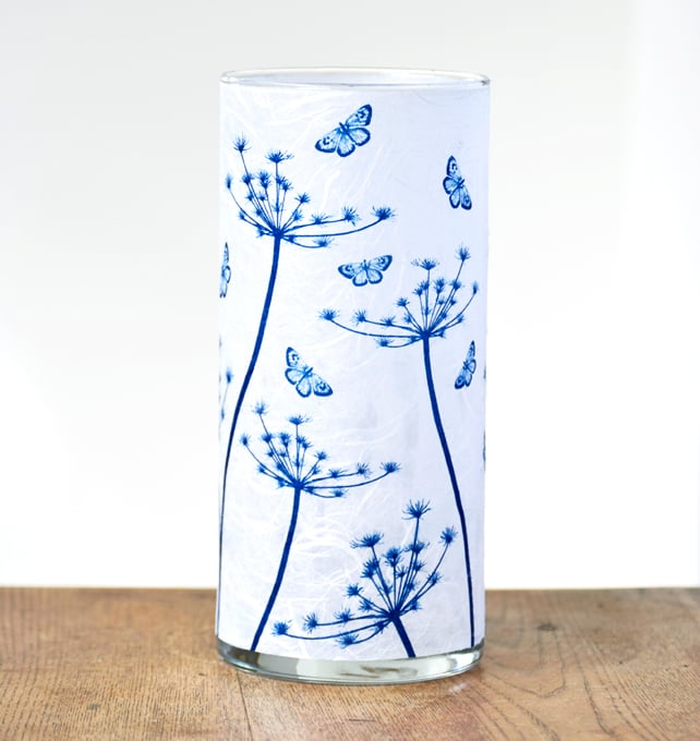 A large cylinder vase with a pretty blue design of Cow Parsley seed heads and delicately translucent butterflies. Created using the Cyanotype technique on mulberry paper then applied to glass.