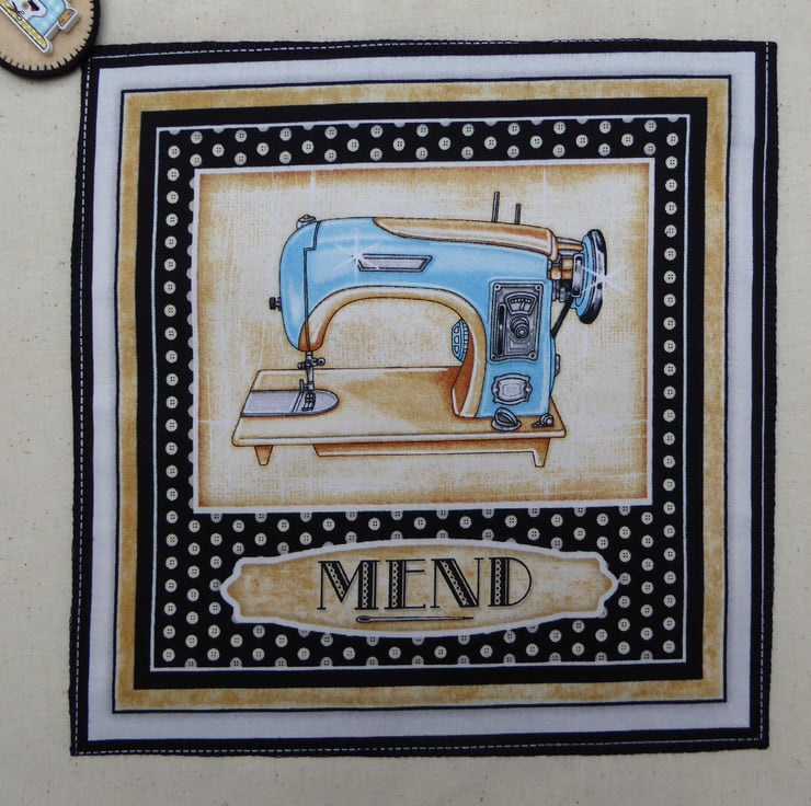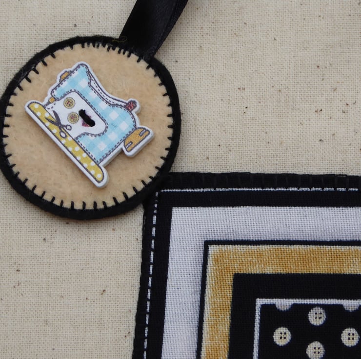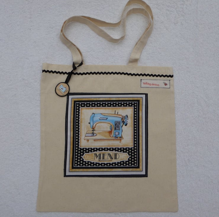 I have machine appliqued this sewing machine print panel to decorate the front of this bag. and then added a line of ric-rac and a detachable sewing machine themed bag charm to complete the bag. The bag is plain on the back.