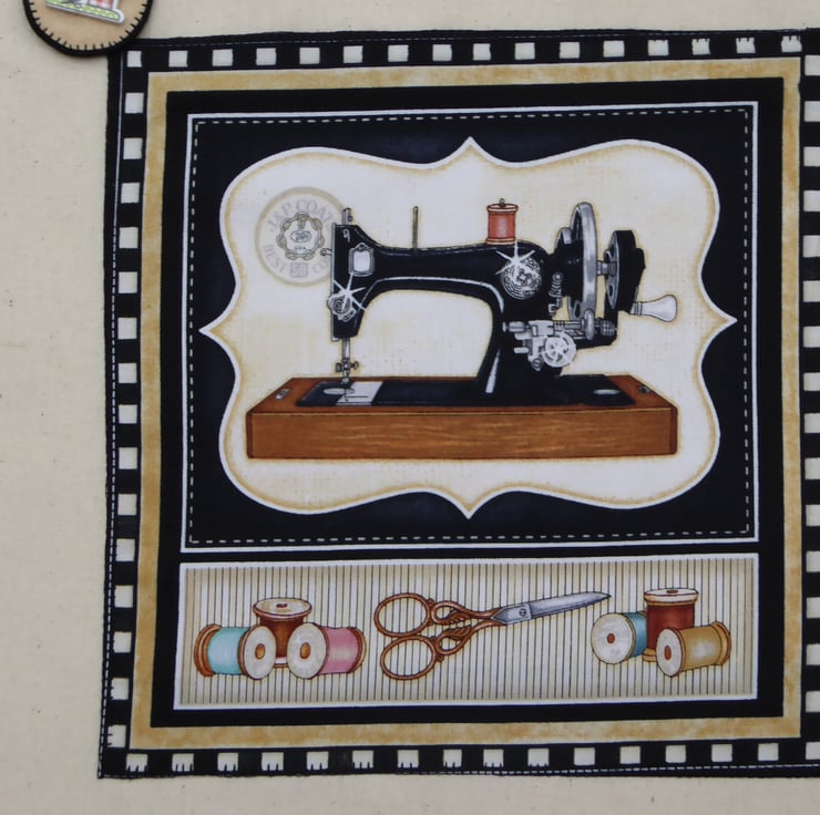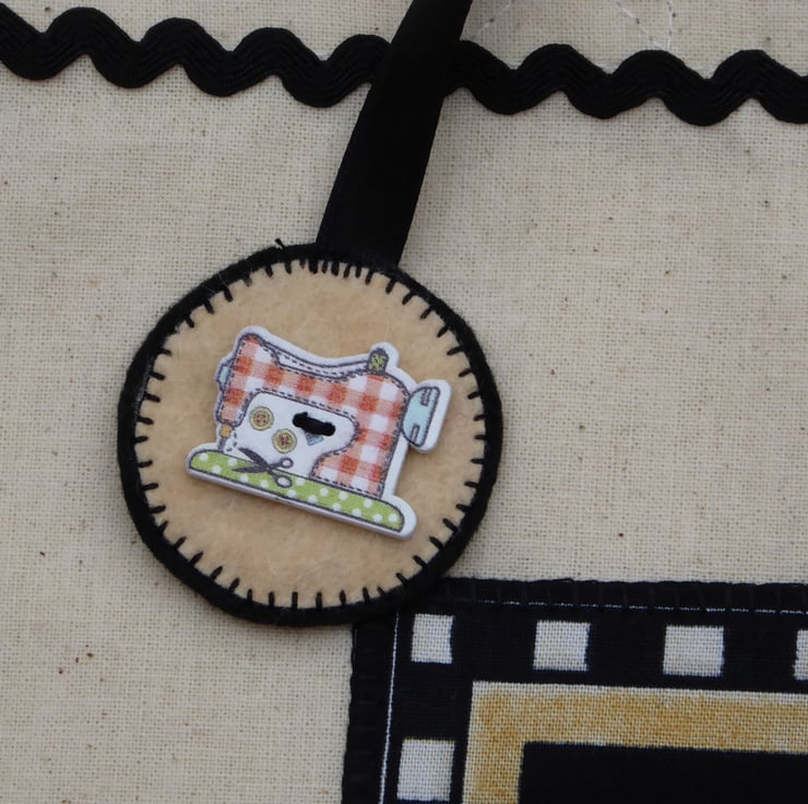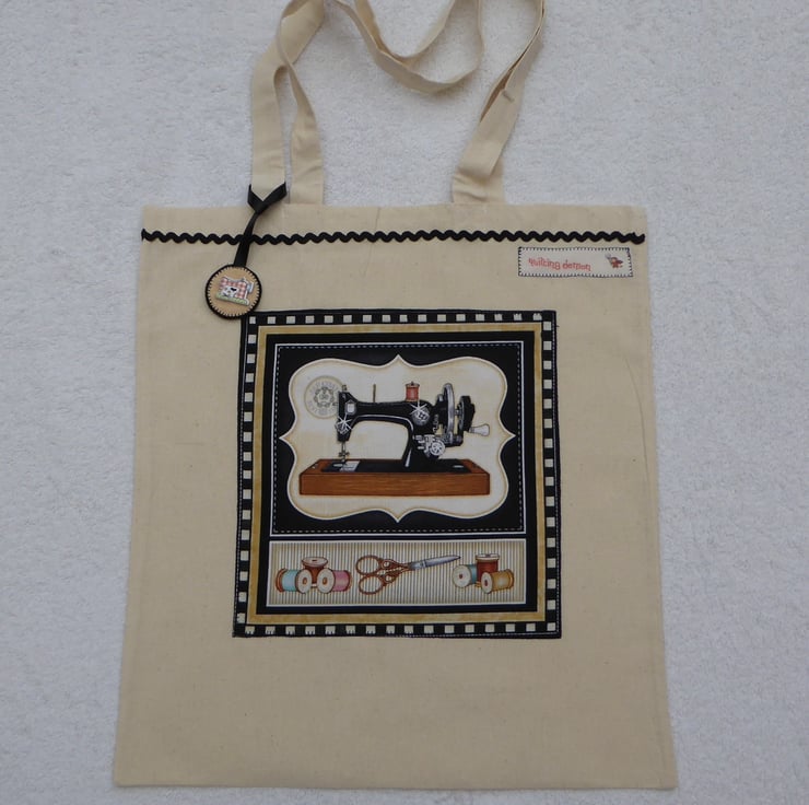 I have machine appliqued this sewing machine print panel to decorate the front of this bag. and then added a line of ric-rac and a detachable sewing machine themed bag charm to complete the bag. The bag is plain on the back.